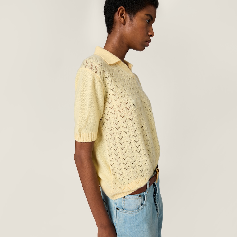 La pregiata morbidezza del cashmere si esprime in una raffinata lavorazione a traforo effetto pizzo, che definisce il fascino di questa polo dalla silhouette versatile, adatta per look eleganti e casual, e valorizzata dall’etichetta logo sul retro. Prezzo € 1.540 per info e per acquistarla, clicca qui.
