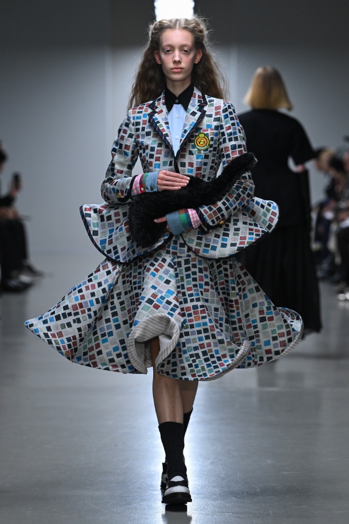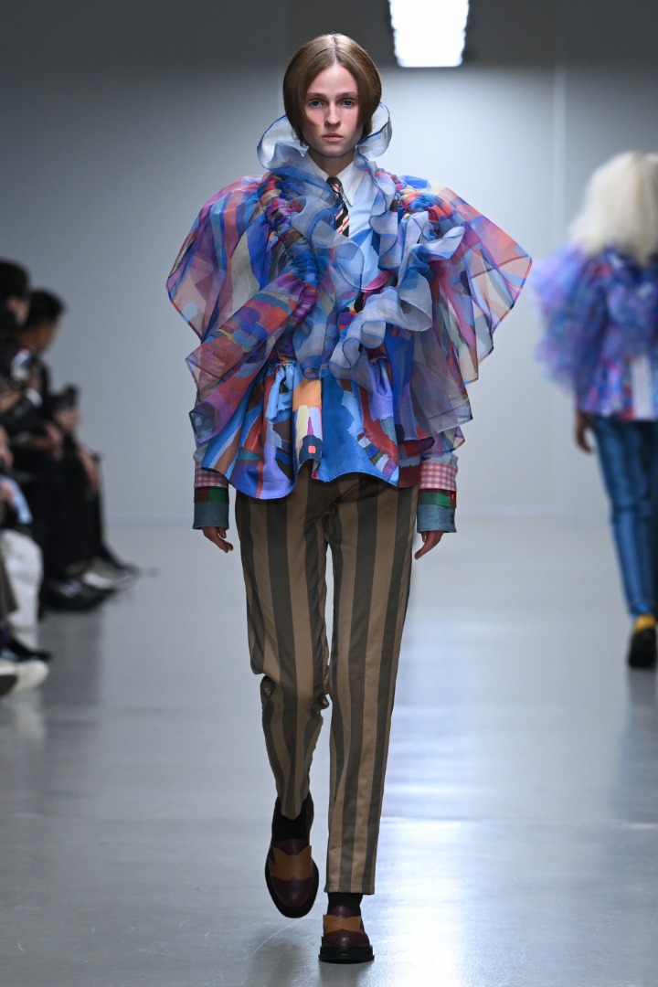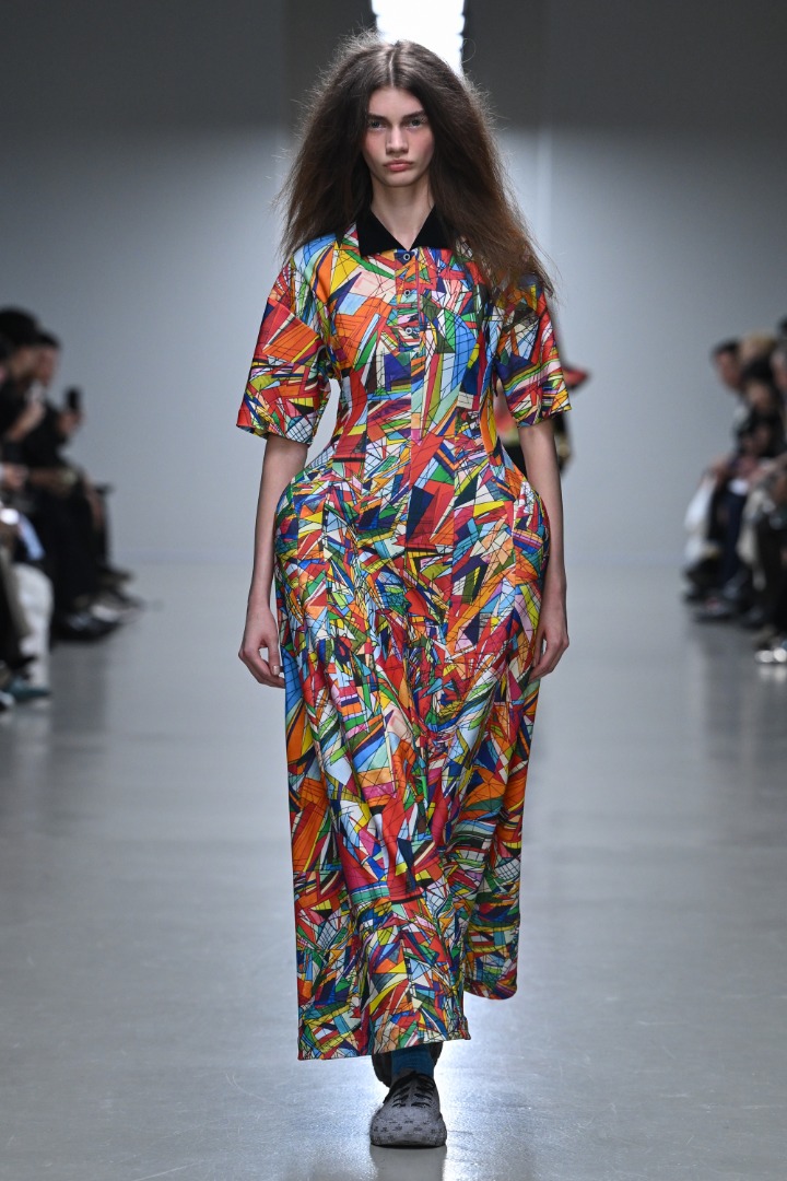 Anrealage sfilata collezione Primavera/Estate 2026 – Quando ho incontrato gli artisti, ho avuto la sensazione di aver toccato una presenza sacra e invisibile. Ciò che hanno creato non è stata mera arte, ma la cristallizzazione della vita stessa. Con la stessa naturalezza con cui respiravano, con forza e bellezza travolgenti, le loro opere nacquero. All’interno del quotidiano ordinario, si nascondeva un non-quotidiano inimmaginabile. Il mondo che vedono. Il paesaggio interiore che si dispiega dentro di loro, quanto è vasto, quanto sconosciuto, quanto è sconfinato. Rimasi solo all’ingresso. Come appare loro il mondo? Come ci appare? Perché, pur stando nello stesso luogo, i paesaggi sono diversi? Qual è il confine che divide questo mondo? Quando questo confine viene superato, ciò che emerge è la forma pura di vita. Esprime ♡ il battito del cuore, il cuore, il centro stesso della vita. Ogni battito cardiaco è unico, prova dell’essere vivi, l’essenza dell’esistenza individuale. Attraverso la moda, voglio rendere visibile questa esistenza. Per lasciare che i vestiti sostengano la vita. Per indossare il battito cardiaco informe.