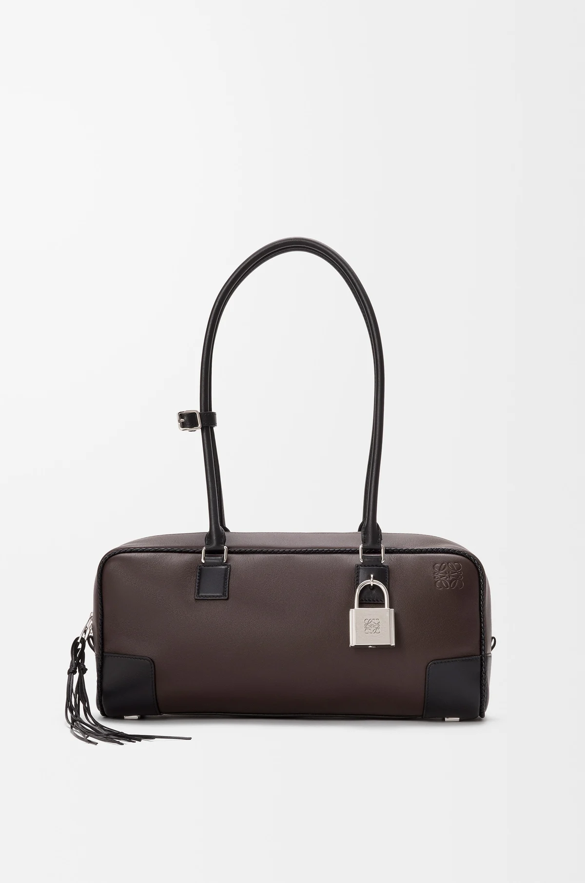 La borsa Amazona presenta una forma classica esaltata da un iconico lucchetto, rivisitata in una versione da bowling allungata per essere portata a spalla grazie ai lunghi manici. Questa versione è realizzata in pelle di vitello classica bicolore con tirazip con nappine e fettucce intrecciate. Questa borsa fa parte della capsule collection per Capodanno. Prezzo € 3.900 per info e per acquistarla, clicca qui.