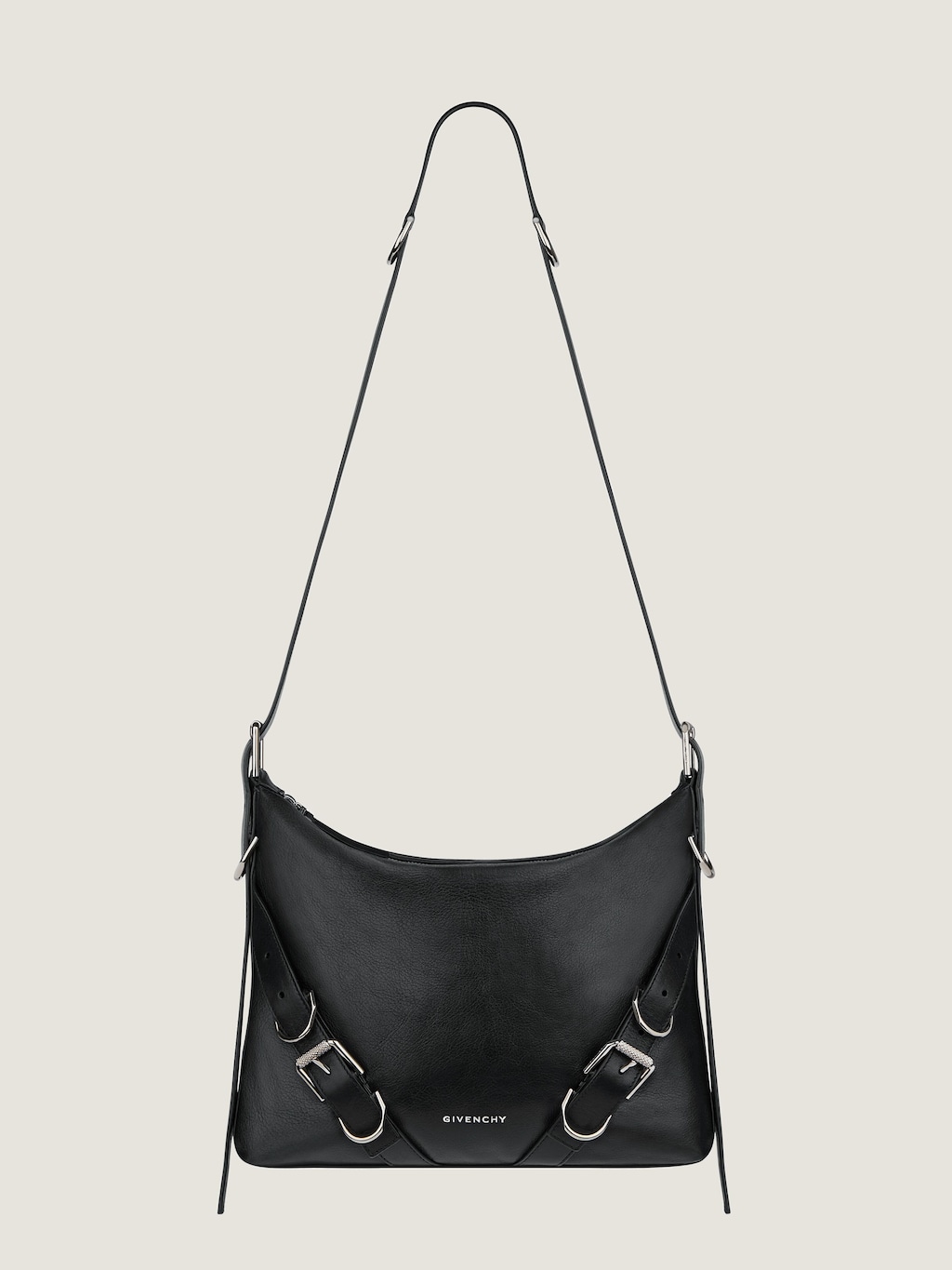 Borsa a tracolla in pelle fiore di vitello morbida, silhouette a V, tracolla regolabile per una portabilità a spalla o a tracolla, fibbie in metallo con incisione GIVENCHY, dettagli metallici finitura argento. Prezzo € 1.850 per info e per acquistarla, clicca qui.