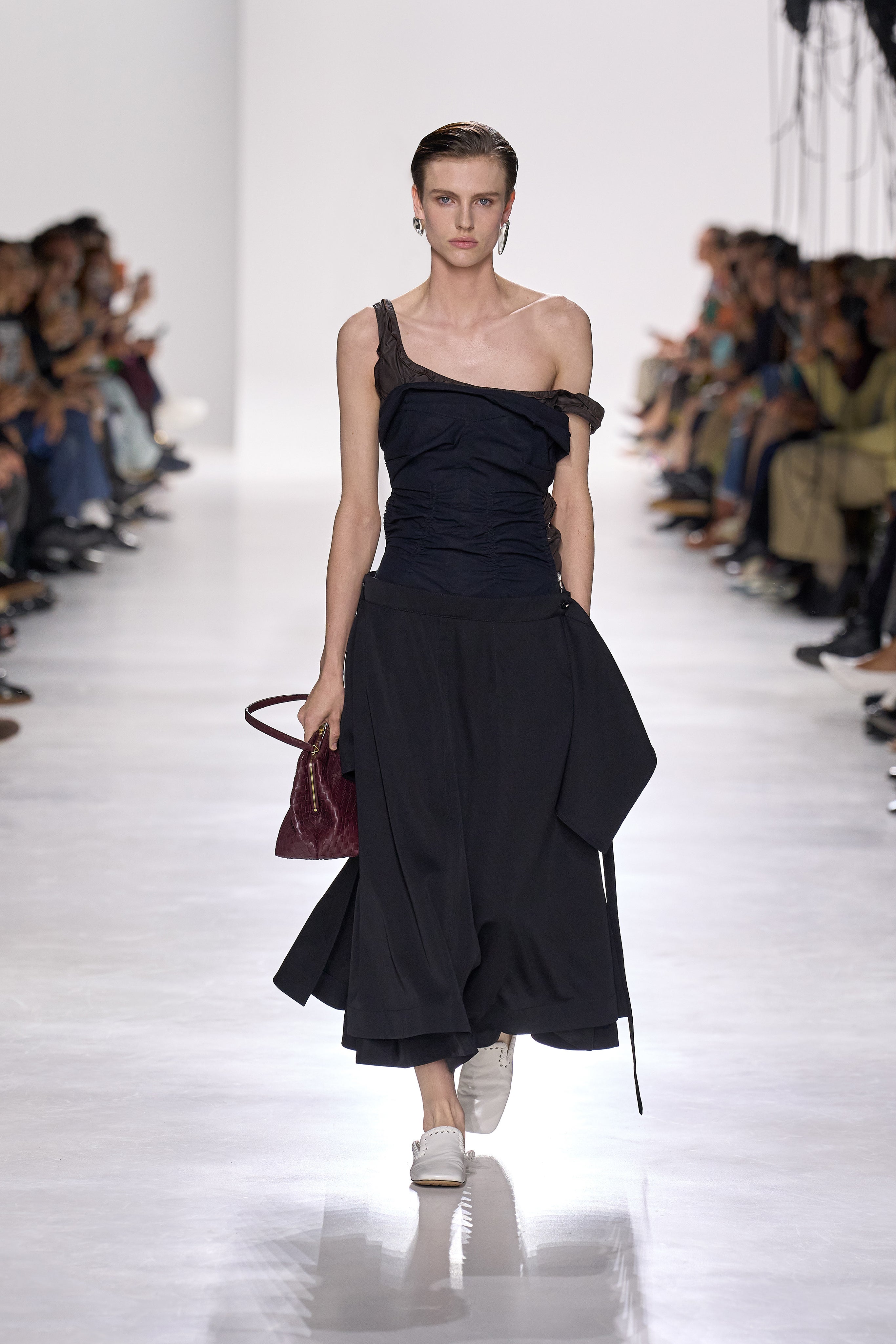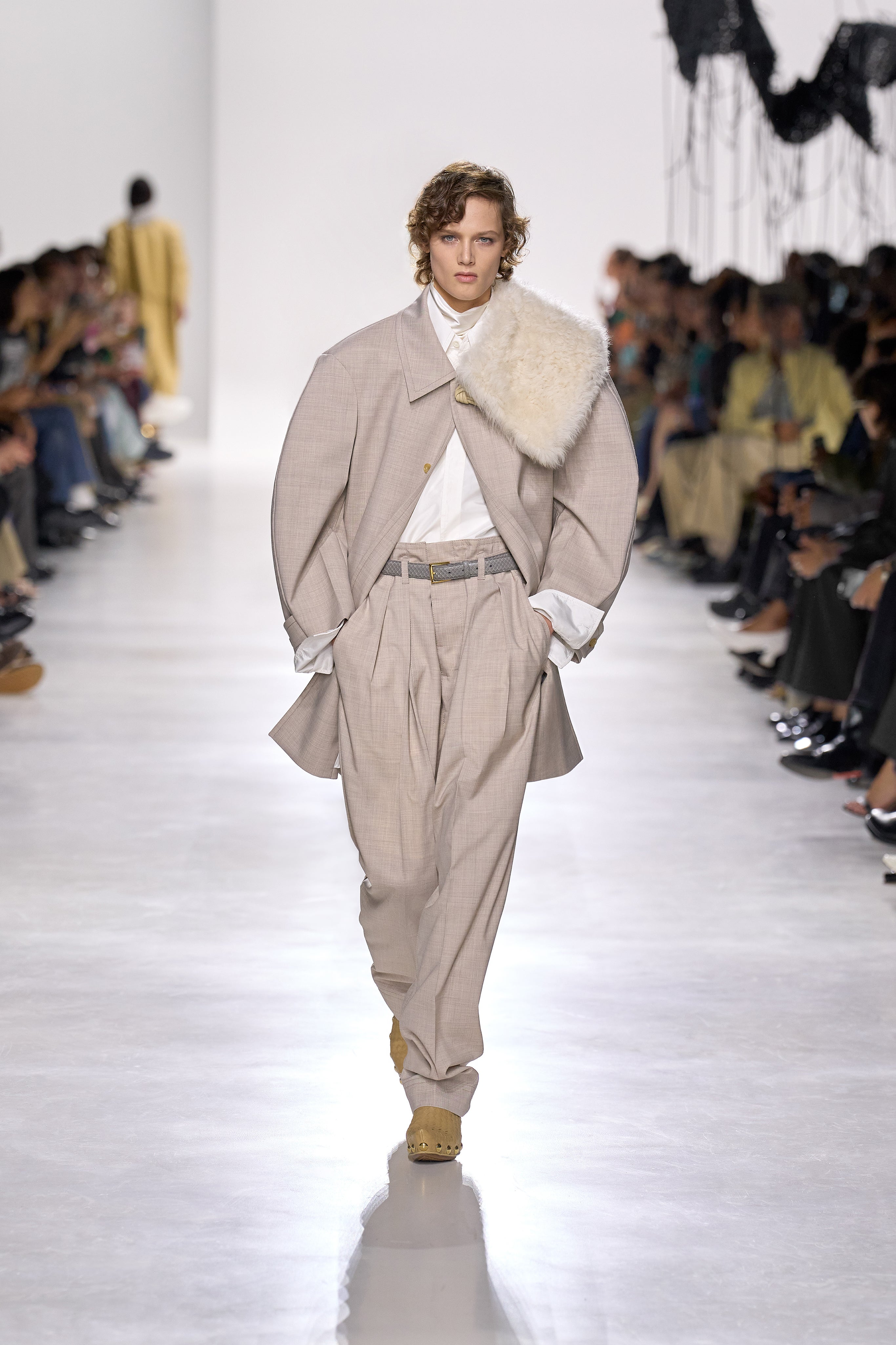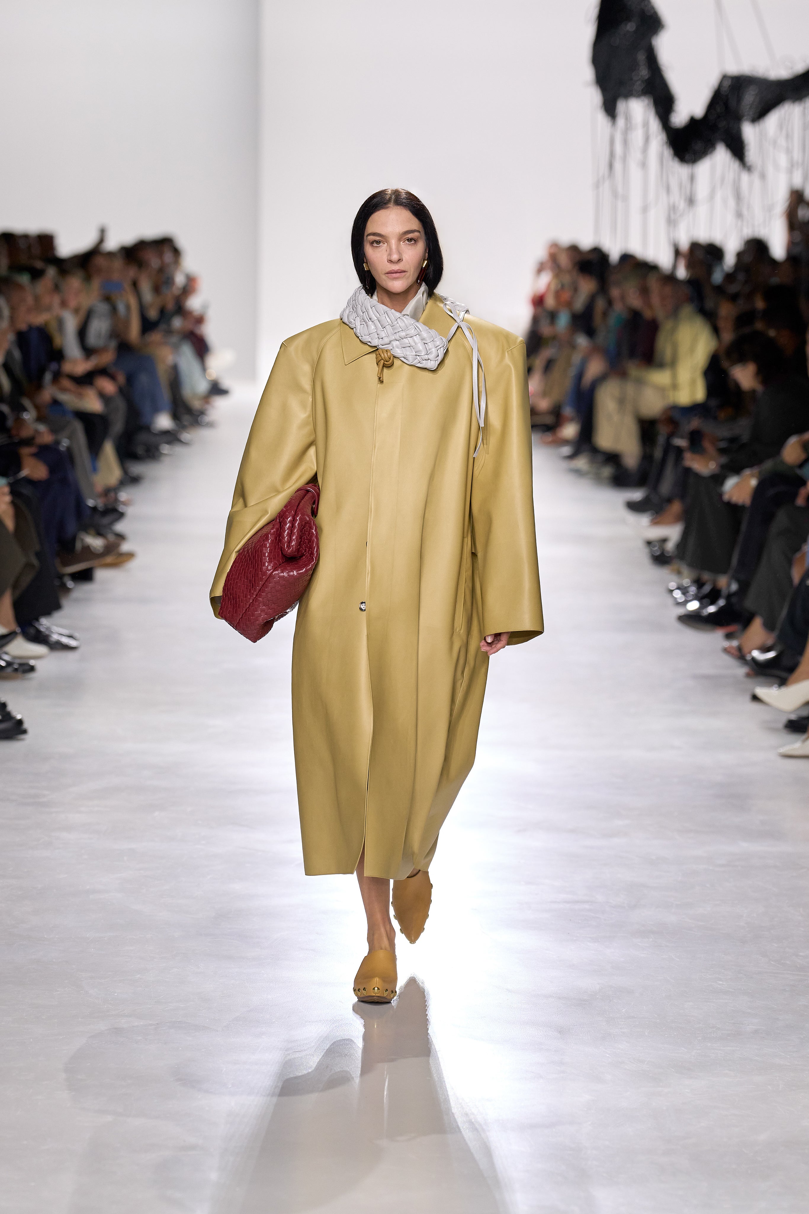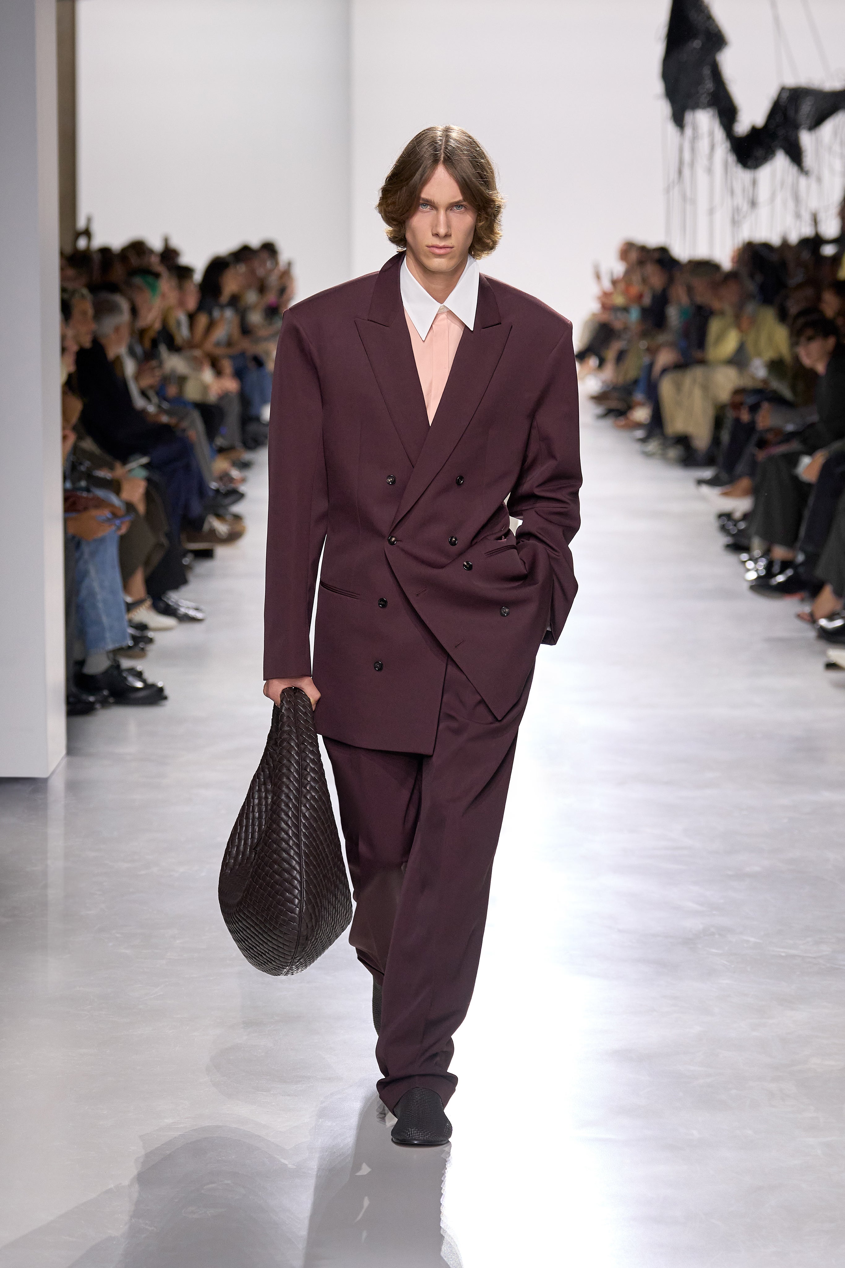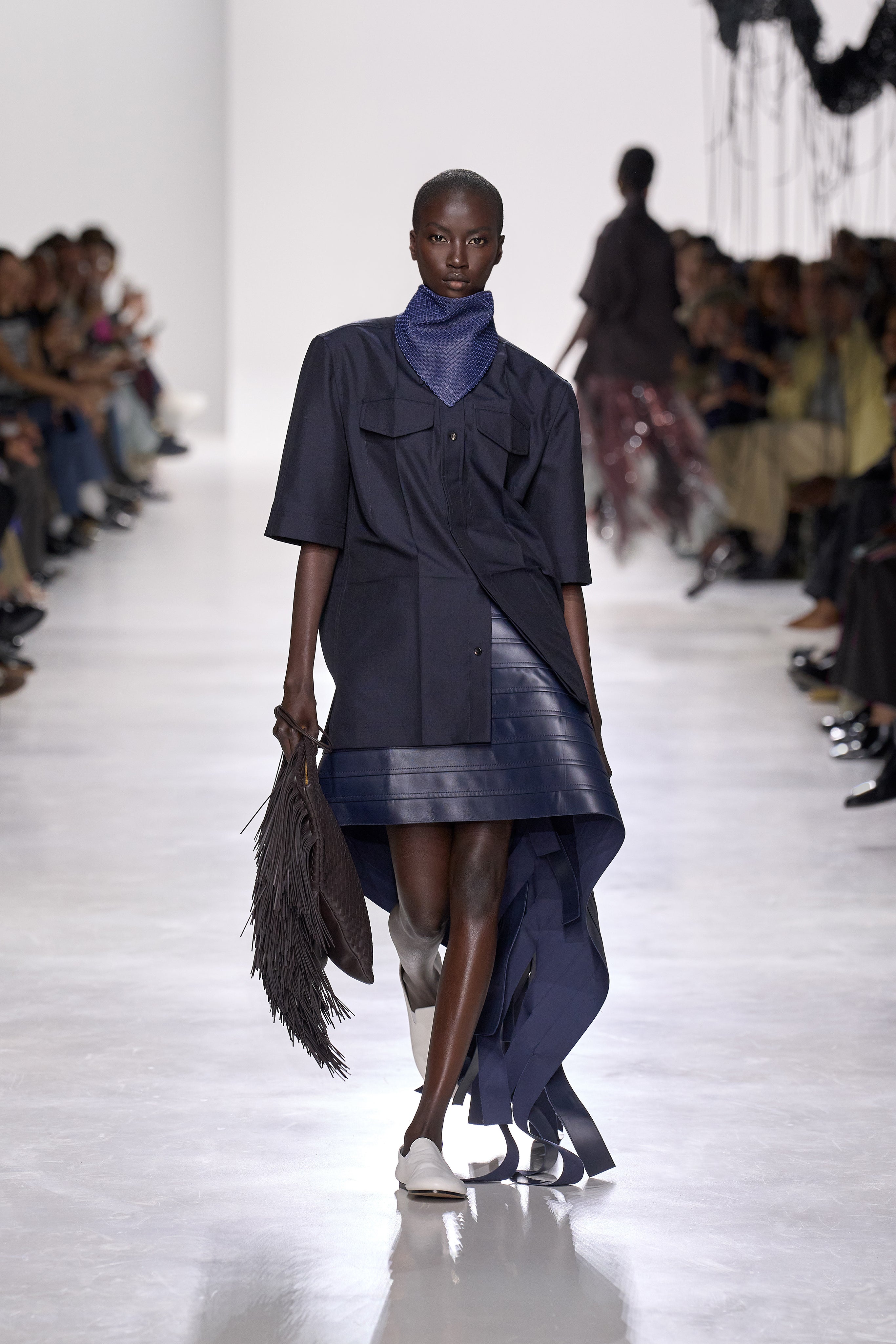 Summer 2026 reinterpreta il tema chiave di ‘soft functionality’ da sempre parte dell’identità di Bottega Veneta e del suo iconico Intrecciato. La collezione celebra la meticolosa lavorazione artigianale della maison con giacche e gonne leggere dal movimento fluido, realizzate in vetroresina riciclata, insieme a un mantello in nappa frangiata, che ha richiesto oltre 4.000 ore di lavoro. Linee scultoree incontrano texture ricche e materiche, con nappine, volant e dettagli soffici. I tessuti estivi, leggeri, si combinano a costruzioni sartoriali rigorose, modellate con la precisione e la disciplina della sartoria maschile tradizionale. Le borse iconiche vengono reinterpretate in nuove forme e proporzioni, mentre tra le novità spiccano la morbida borsa Squash, una clutch da sera con nappine e una tote dalla struttura rigida.