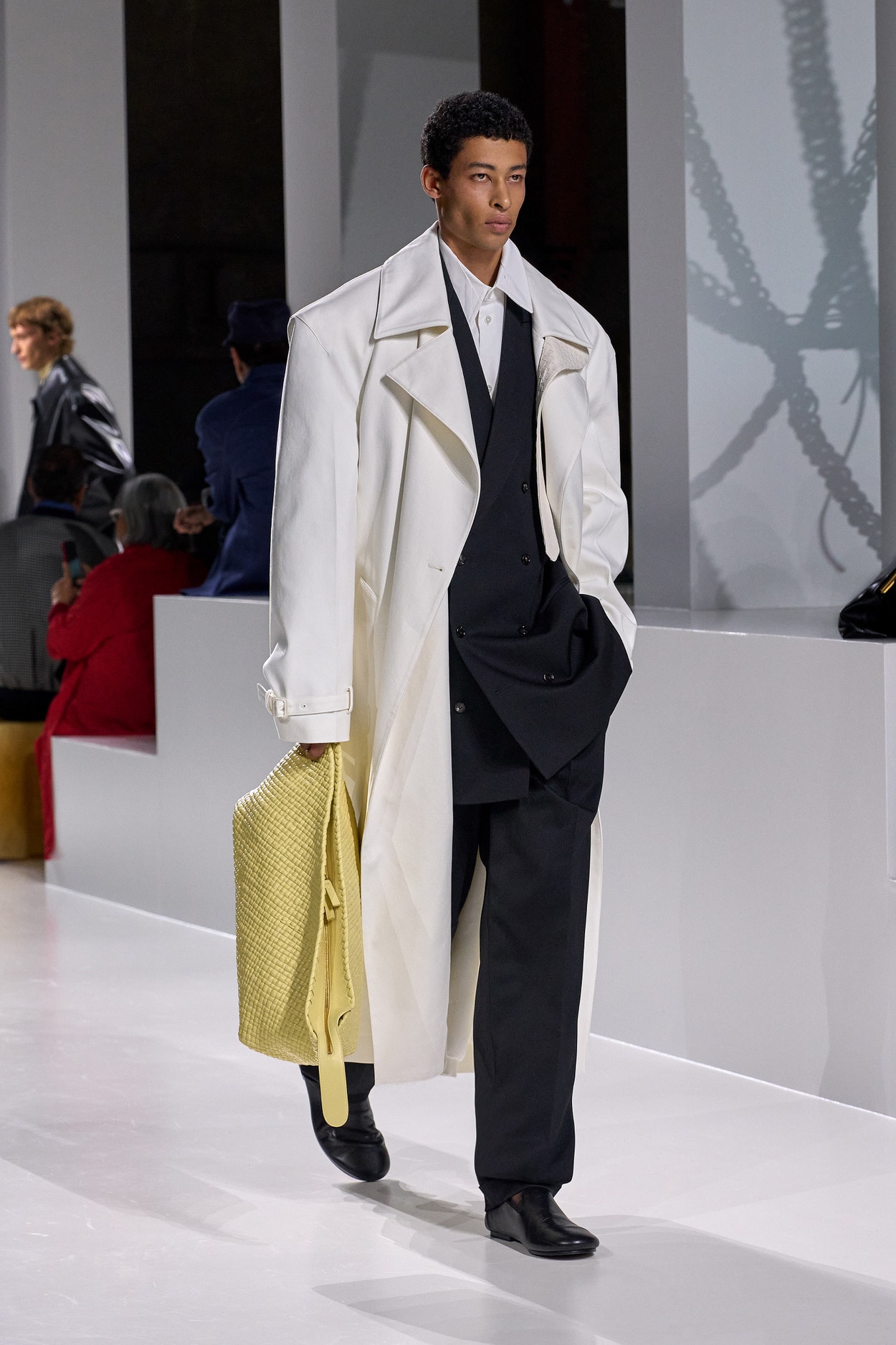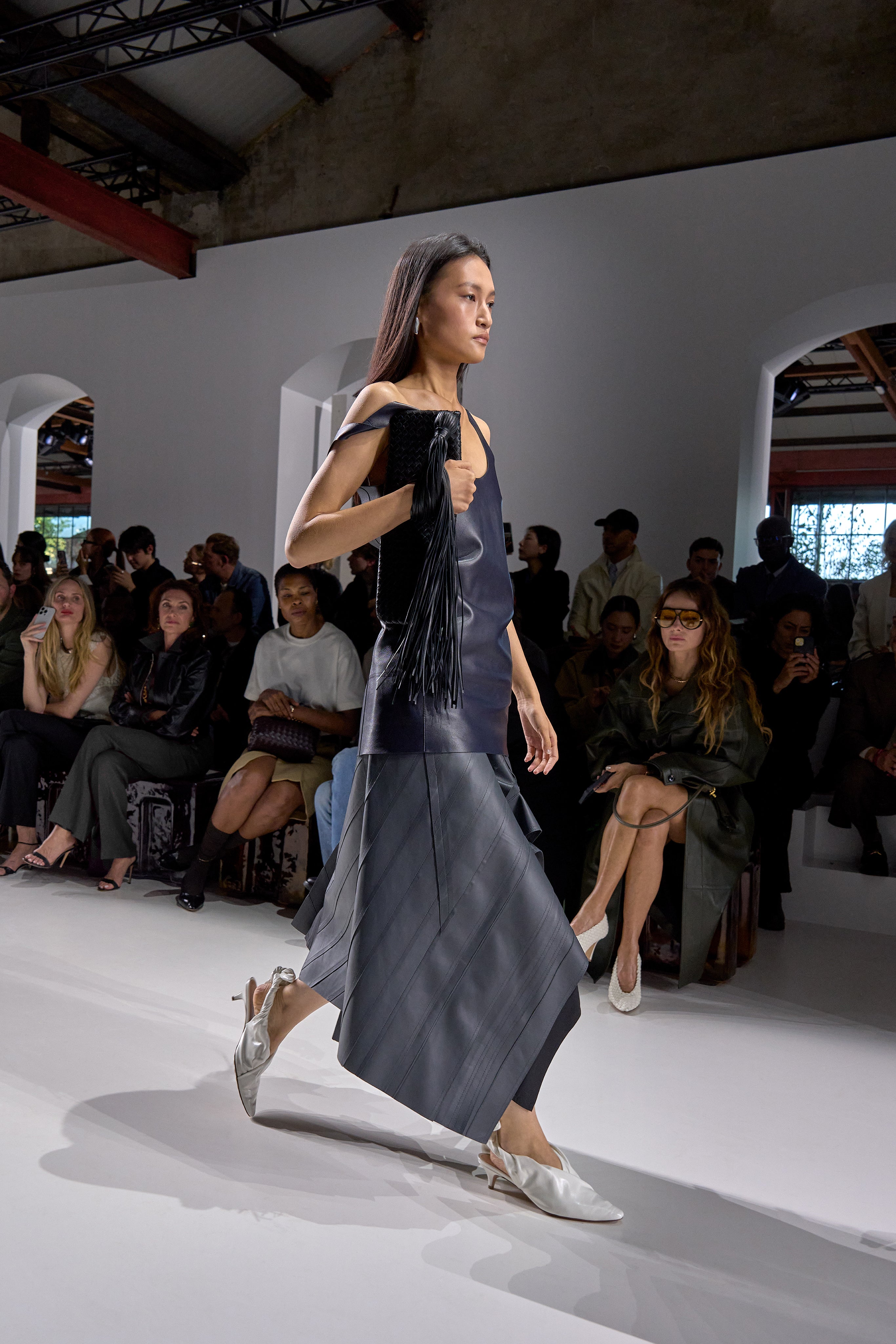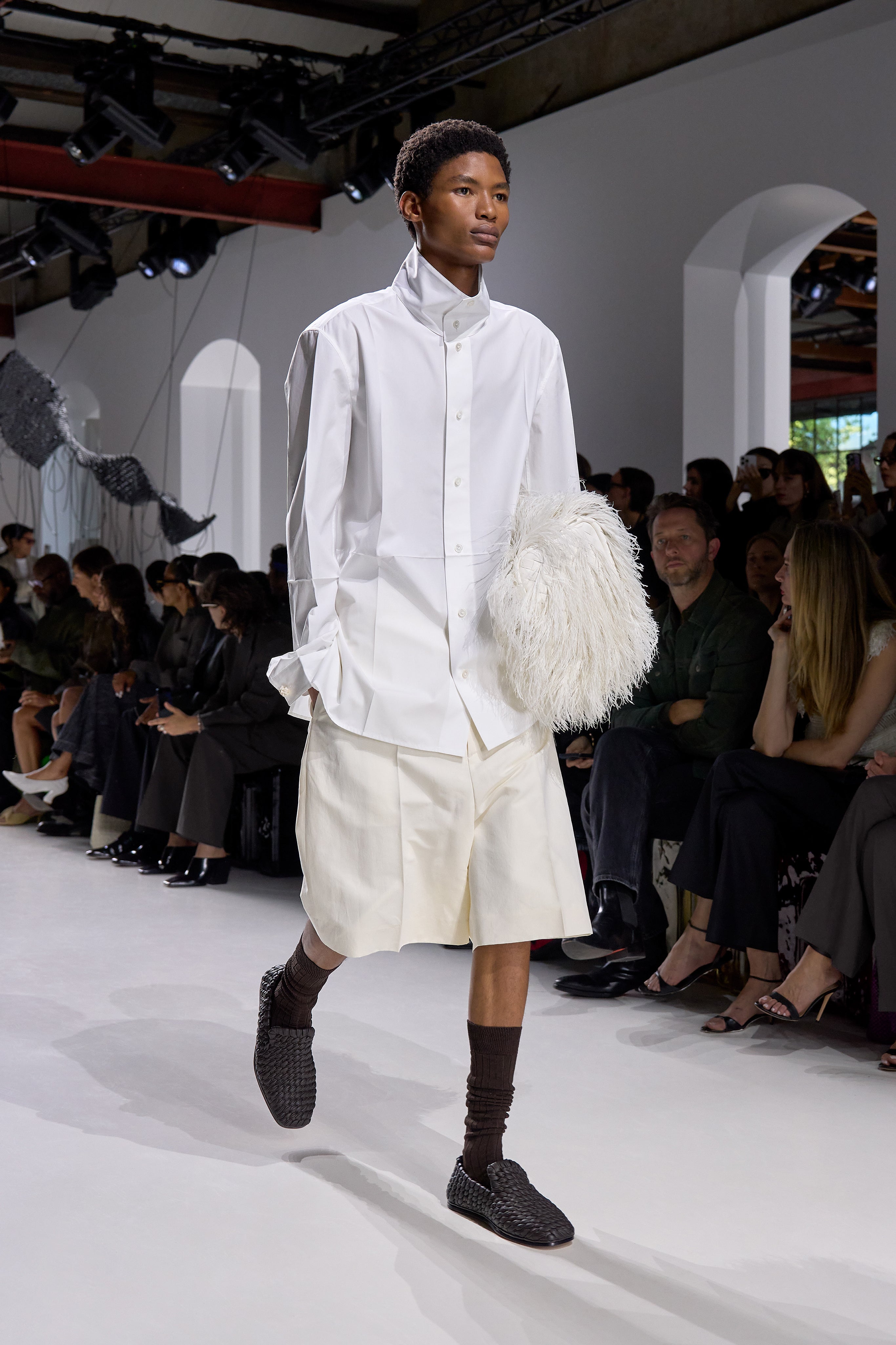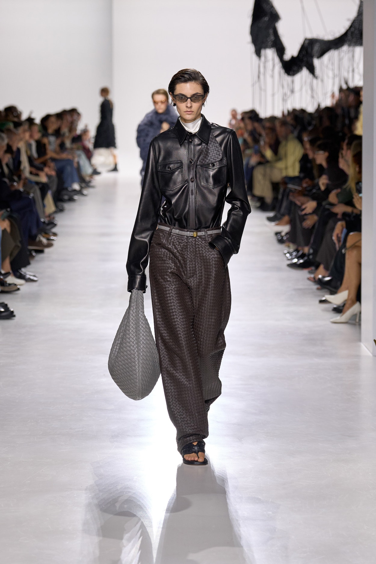 Summer 2026 reinterpreta il tema chiave di ‘soft functionality’ da sempre parte dell’identità di Bottega Veneta e del suo iconico Intrecciato. La collezione celebra la meticolosa lavorazione artigianale della maison con giacche e gonne leggere dal movimento fluido, realizzate in vetroresina riciclata, insieme a un mantello in nappa frangiata, che ha richiesto oltre 4.000 ore di lavoro. Linee scultoree incontrano texture ricche e materiche, con nappine, volant e dettagli soffici. I tessuti estivi, leggeri, si combinano a costruzioni sartoriali rigorose, modellate con la precisione e la disciplina della sartoria maschile tradizionale. Le borse iconiche vengono reinterpretate in nuove forme e proporzioni, mentre tra le novità spiccano la morbida borsa Squash, una clutch da sera con nappine e una tote dalla struttura rigida.