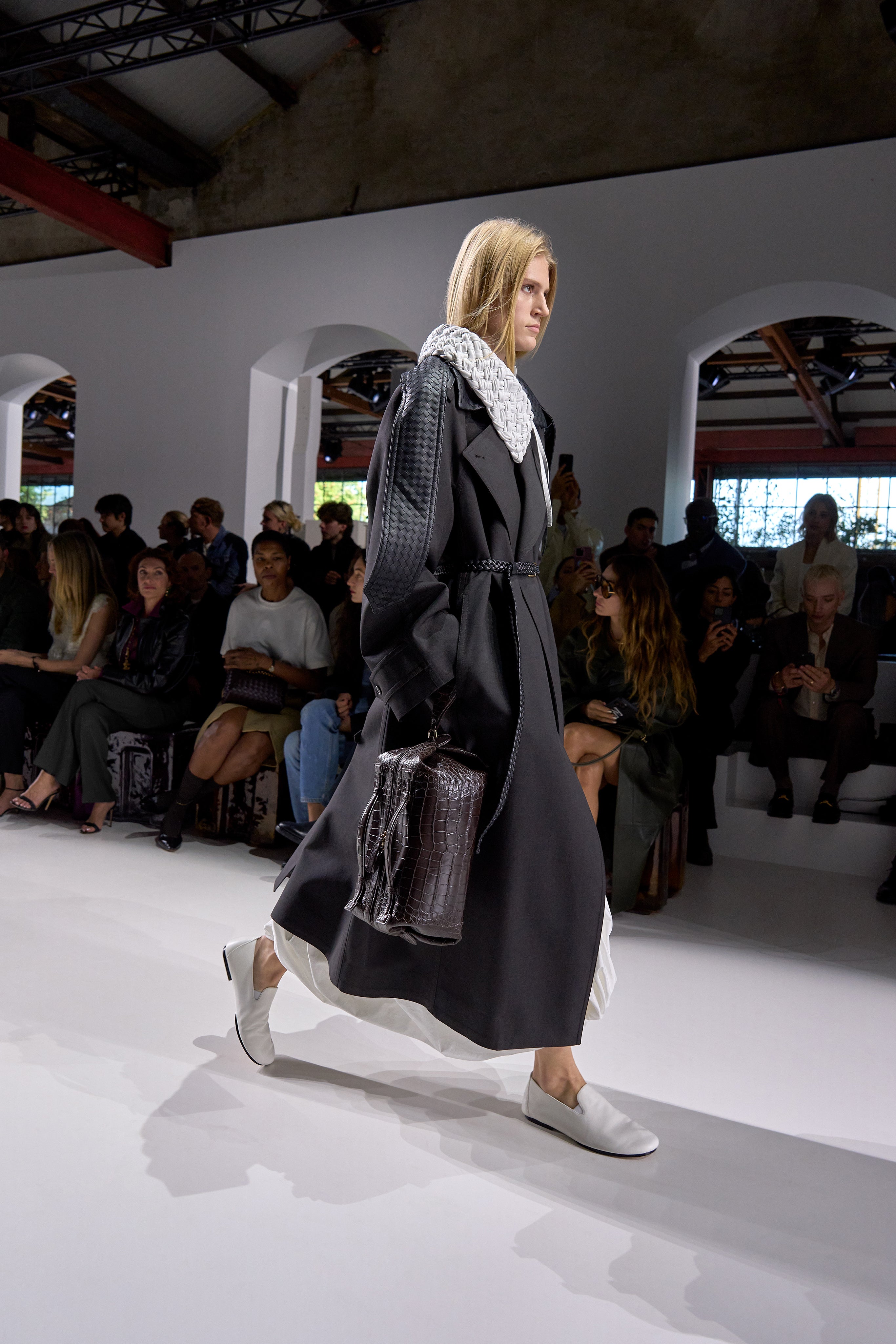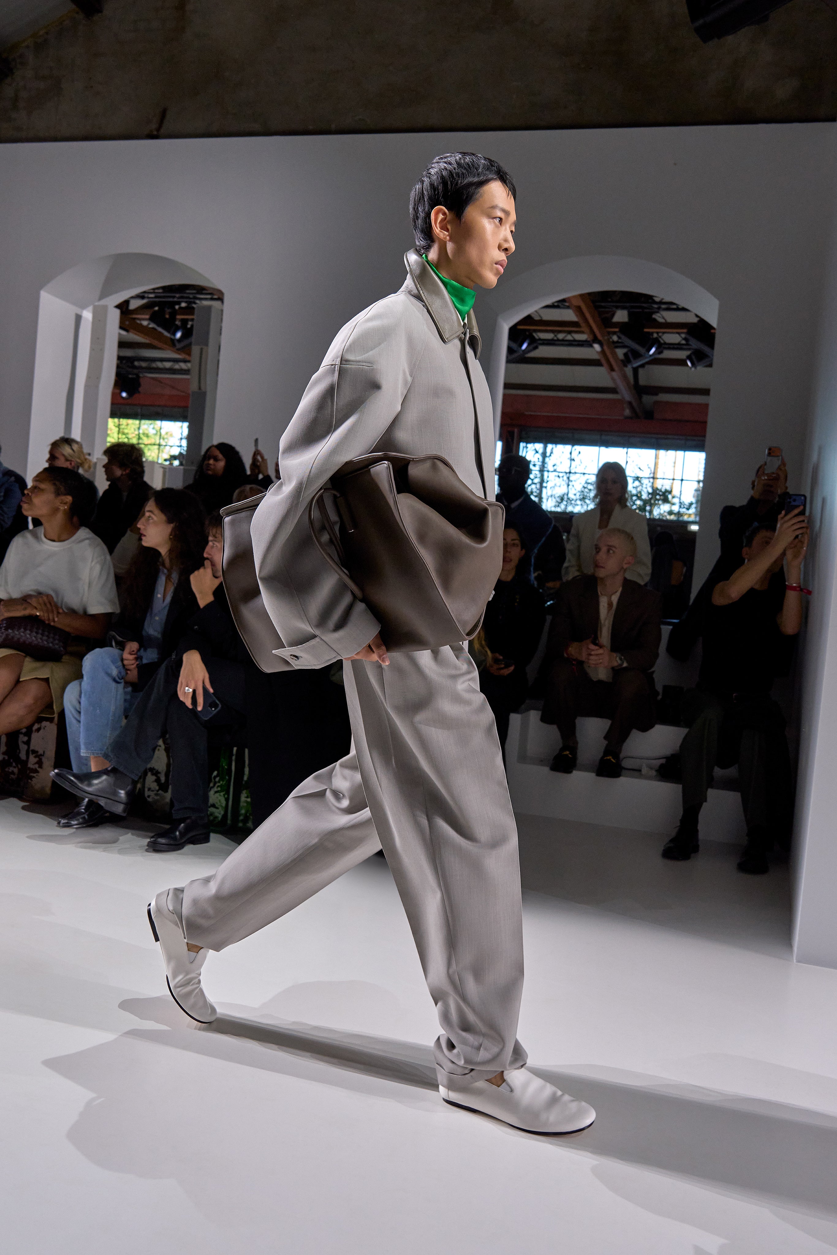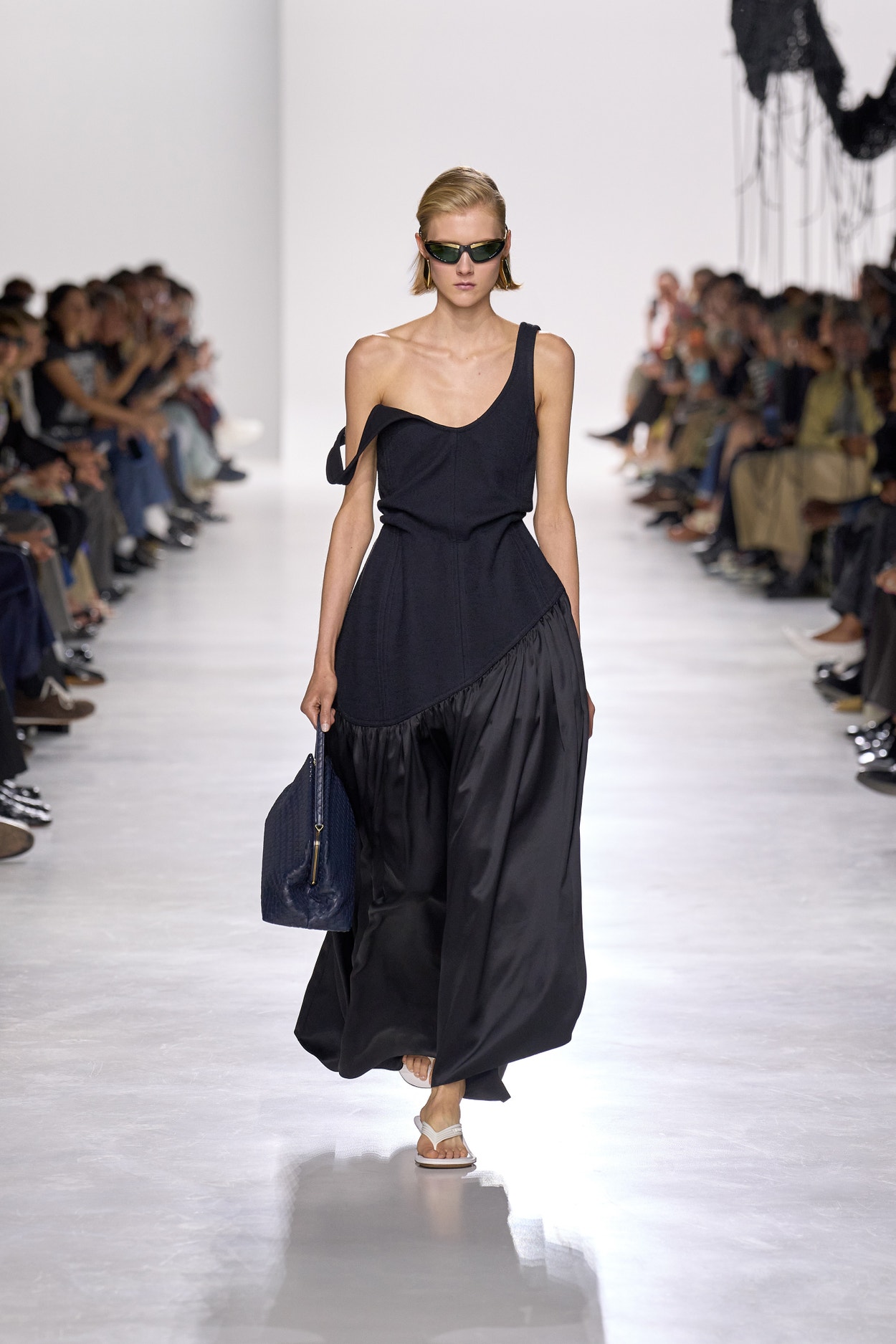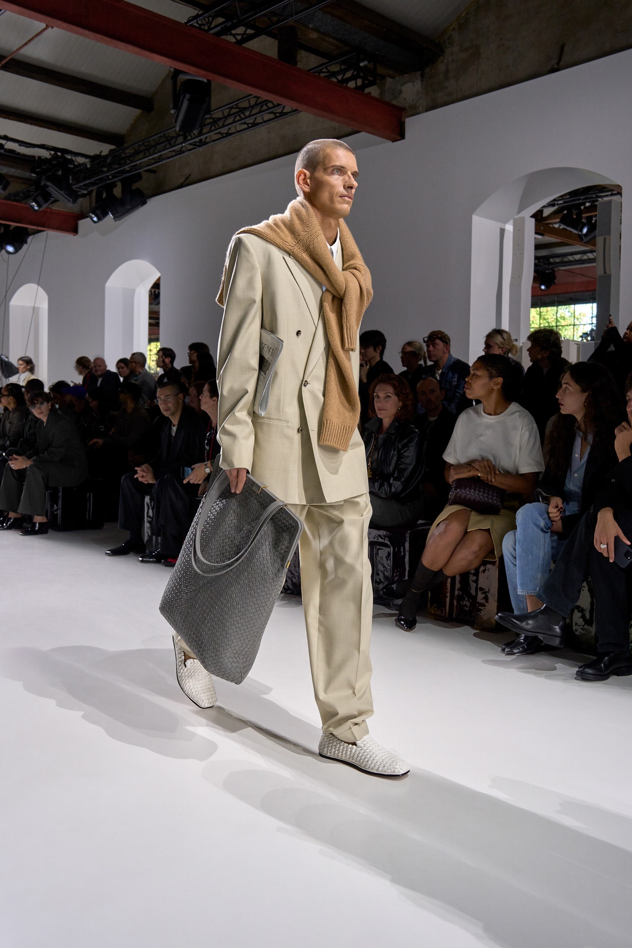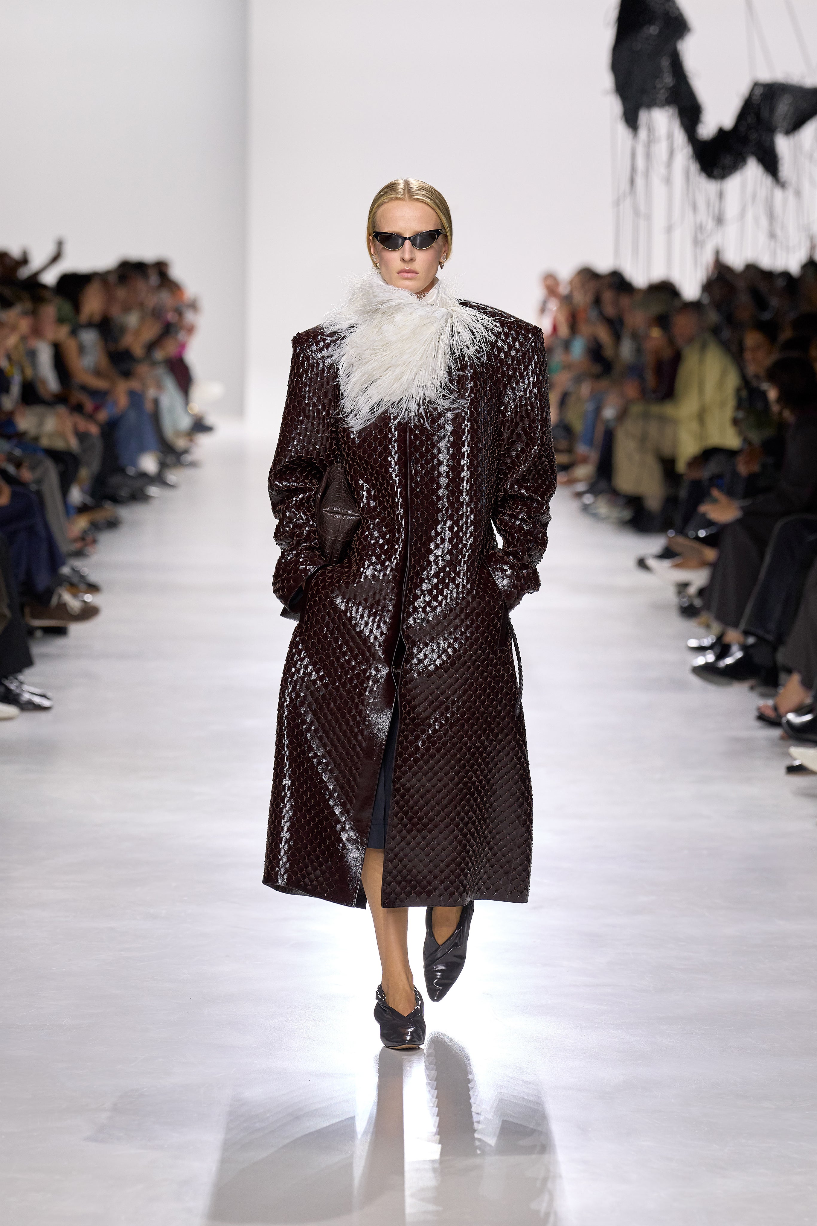 Summer 2026 reinterpreta il tema chiave di ‘soft functionality’ da sempre parte dell’identità di Bottega Veneta e del suo iconico Intrecciato. La collezione celebra la meticolosa lavorazione artigianale della maison con giacche e gonne leggere dal movimento fluido, realizzate in vetroresina riciclata, insieme a un mantello in nappa frangiata, che ha richiesto oltre 4.000 ore di lavoro. Linee scultoree incontrano texture ricche e materiche, con nappine, volant e dettagli soffici. I tessuti estivi, leggeri, si combinano a costruzioni sartoriali rigorose, modellate con la precisione e la disciplina della sartoria maschile tradizionale. Le borse iconiche vengono reinterpretate in nuove forme e proporzioni, mentre tra le novità spiccano la morbida borsa Squash, una clutch da sera con nappine e una tote dalla struttura rigida.
