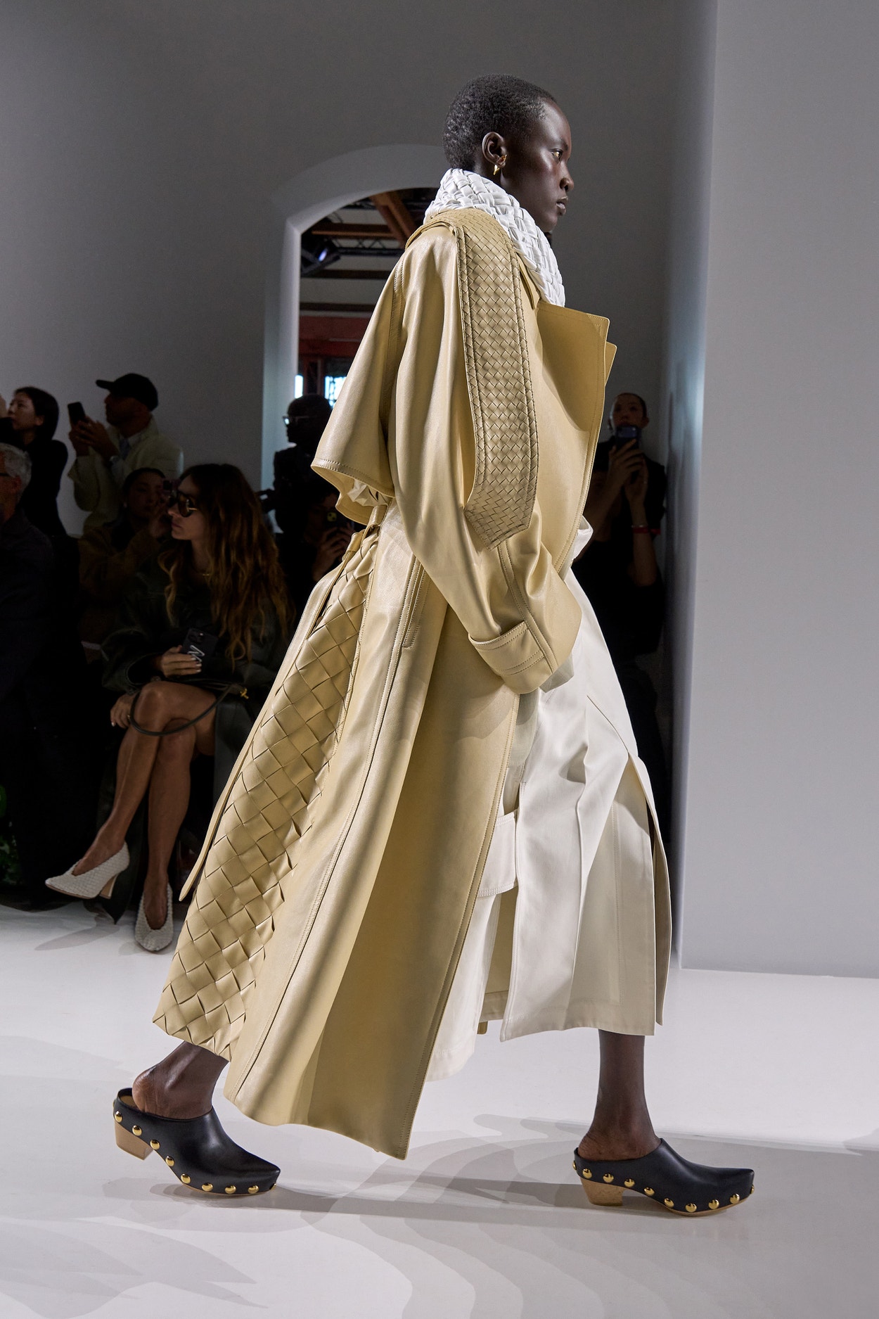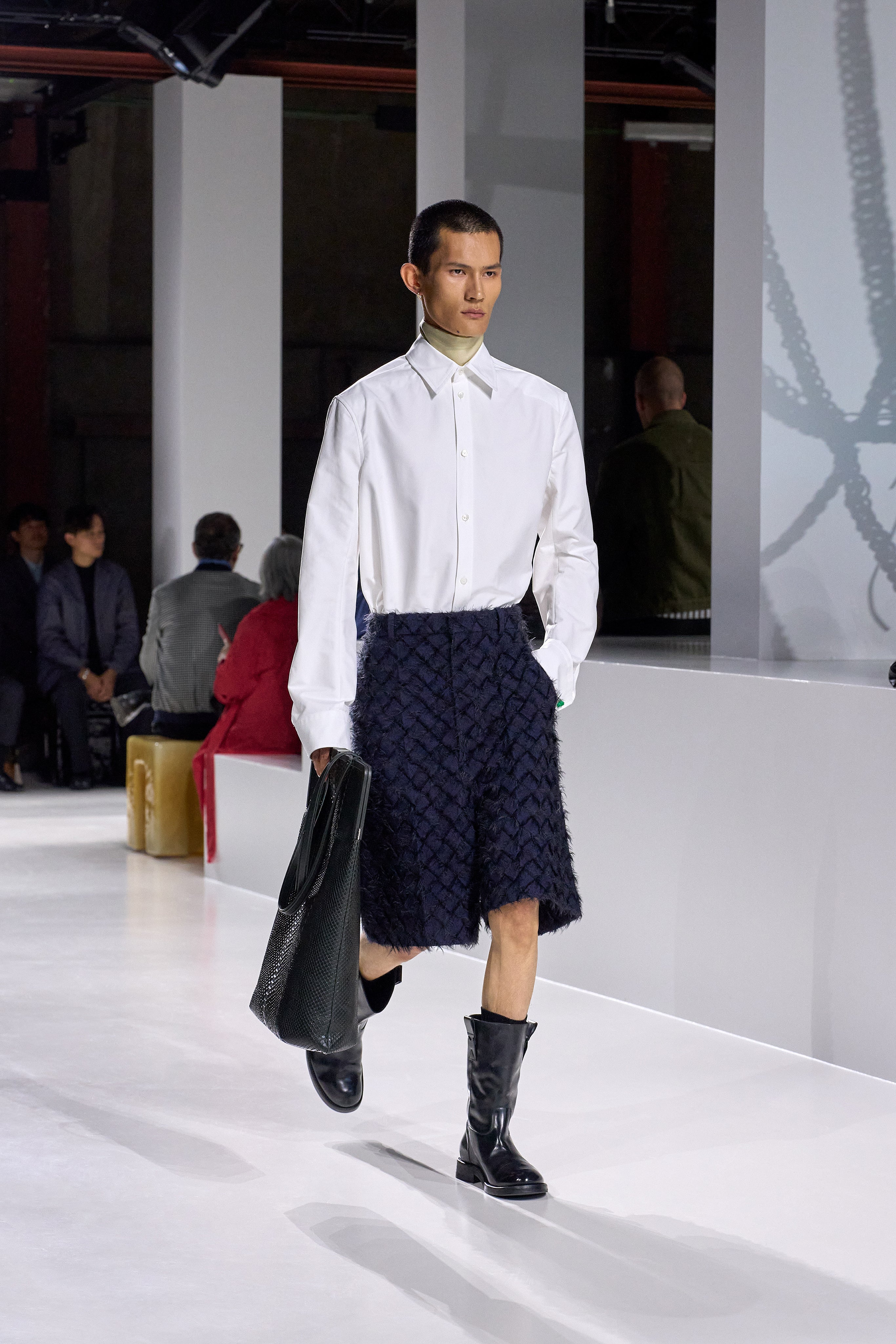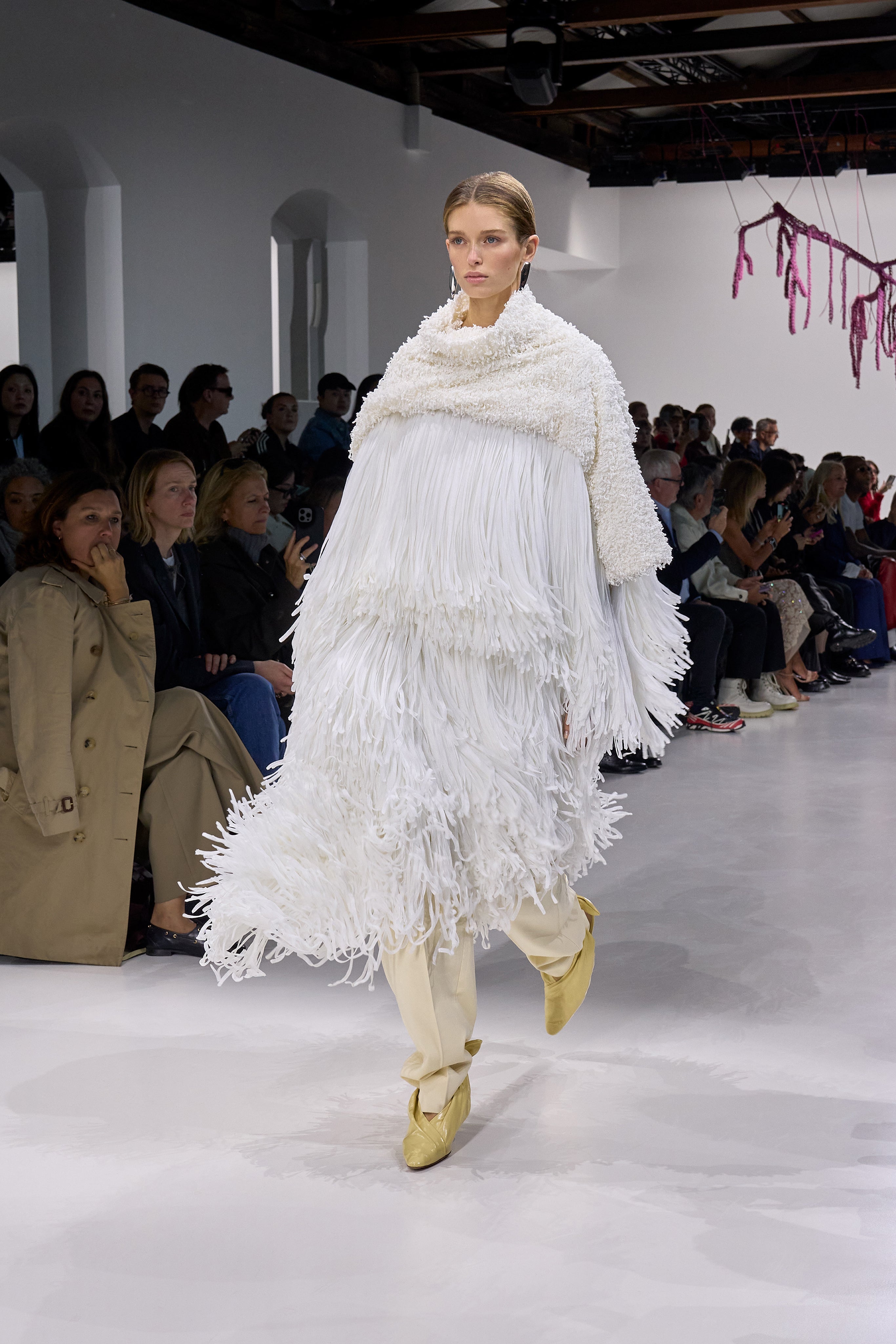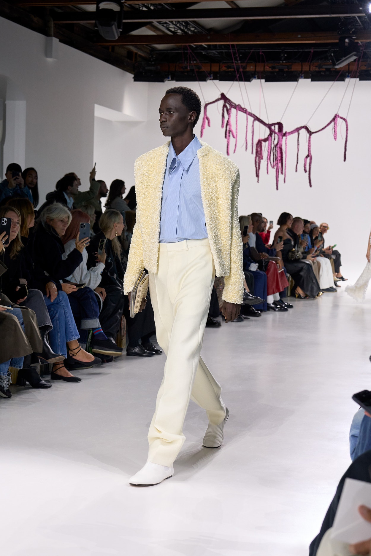 Summer 2026 reinterpreta il tema chiave di ‘soft functionality’ da sempre parte dell’identità di Bottega Veneta e del suo iconico Intrecciato. La collezione celebra la meticolosa lavorazione artigianale della maison con giacche e gonne leggere dal movimento fluido, realizzate in vetroresina riciclata, insieme a un mantello in nappa frangiata, che ha richiesto oltre 4.000 ore di lavoro. Linee scultoree incontrano texture ricche e materiche, con nappine, volant e dettagli soffici. I tessuti estivi, leggeri, si combinano a costruzioni sartoriali rigorose, modellate con la precisione e la disciplina della sartoria maschile tradizionale. Le borse iconiche vengono reinterpretate in nuove forme e proporzioni, mentre tra le novità spiccano la morbida borsa Squash, una clutch da sera con nappine e una tote dalla struttura rigida.