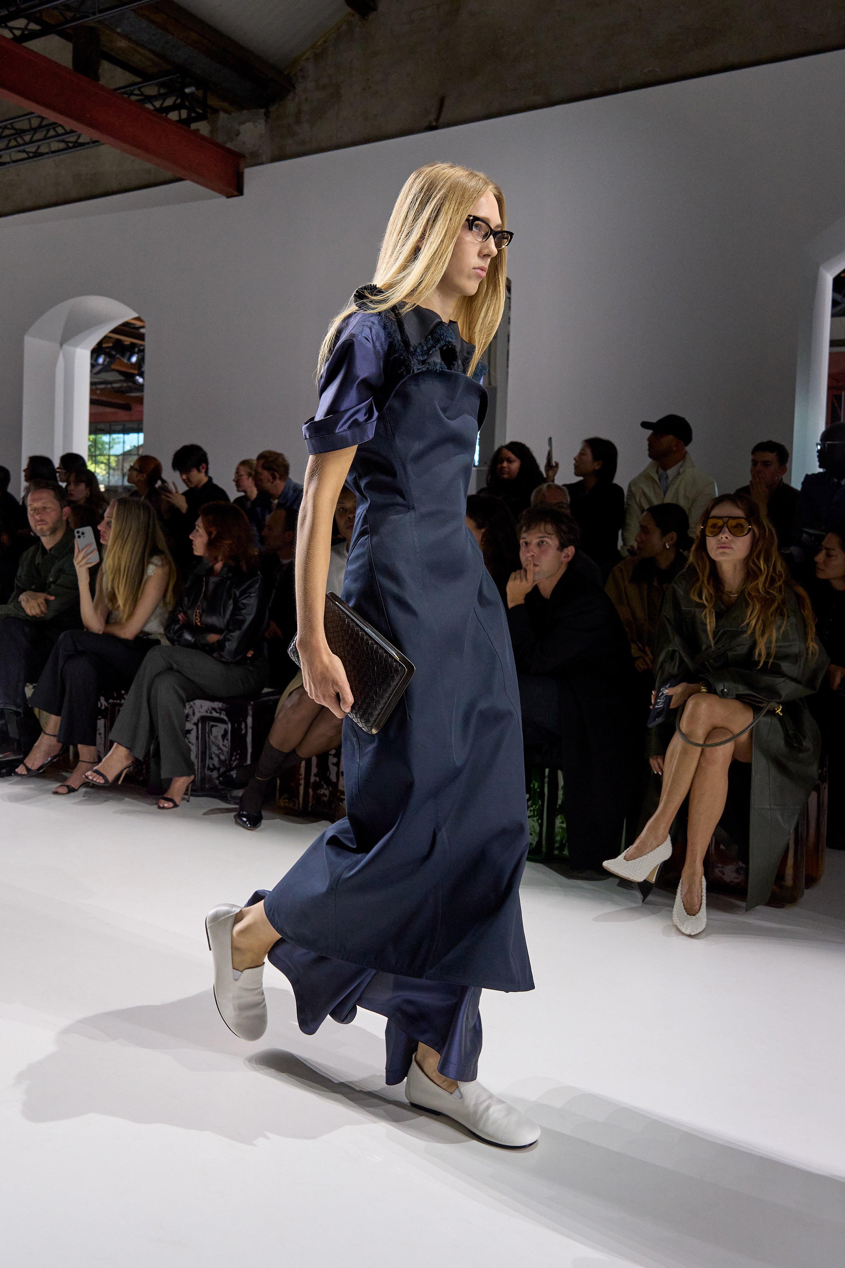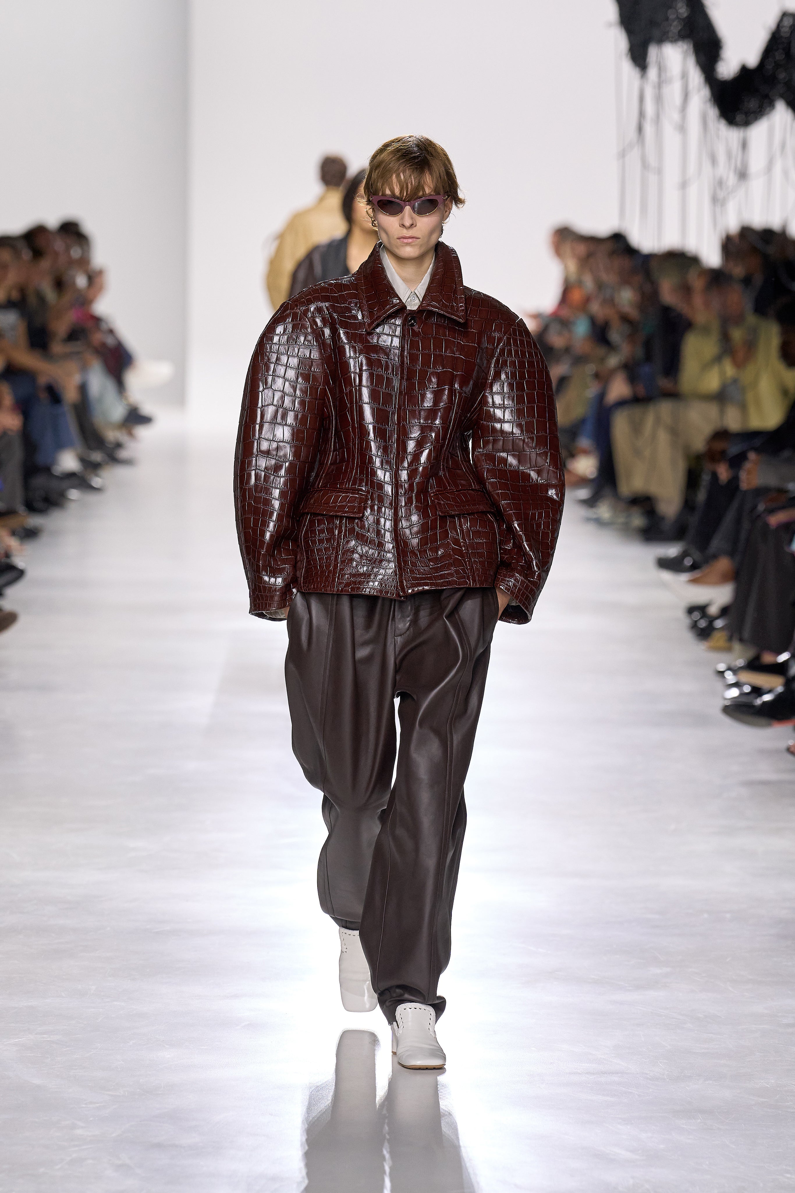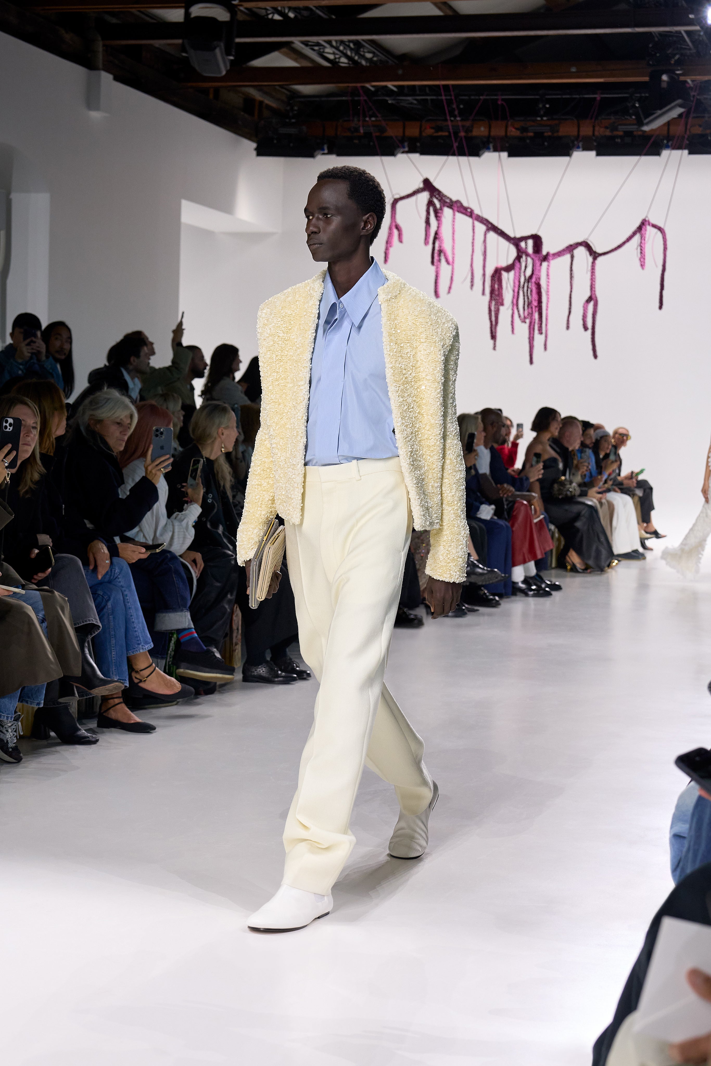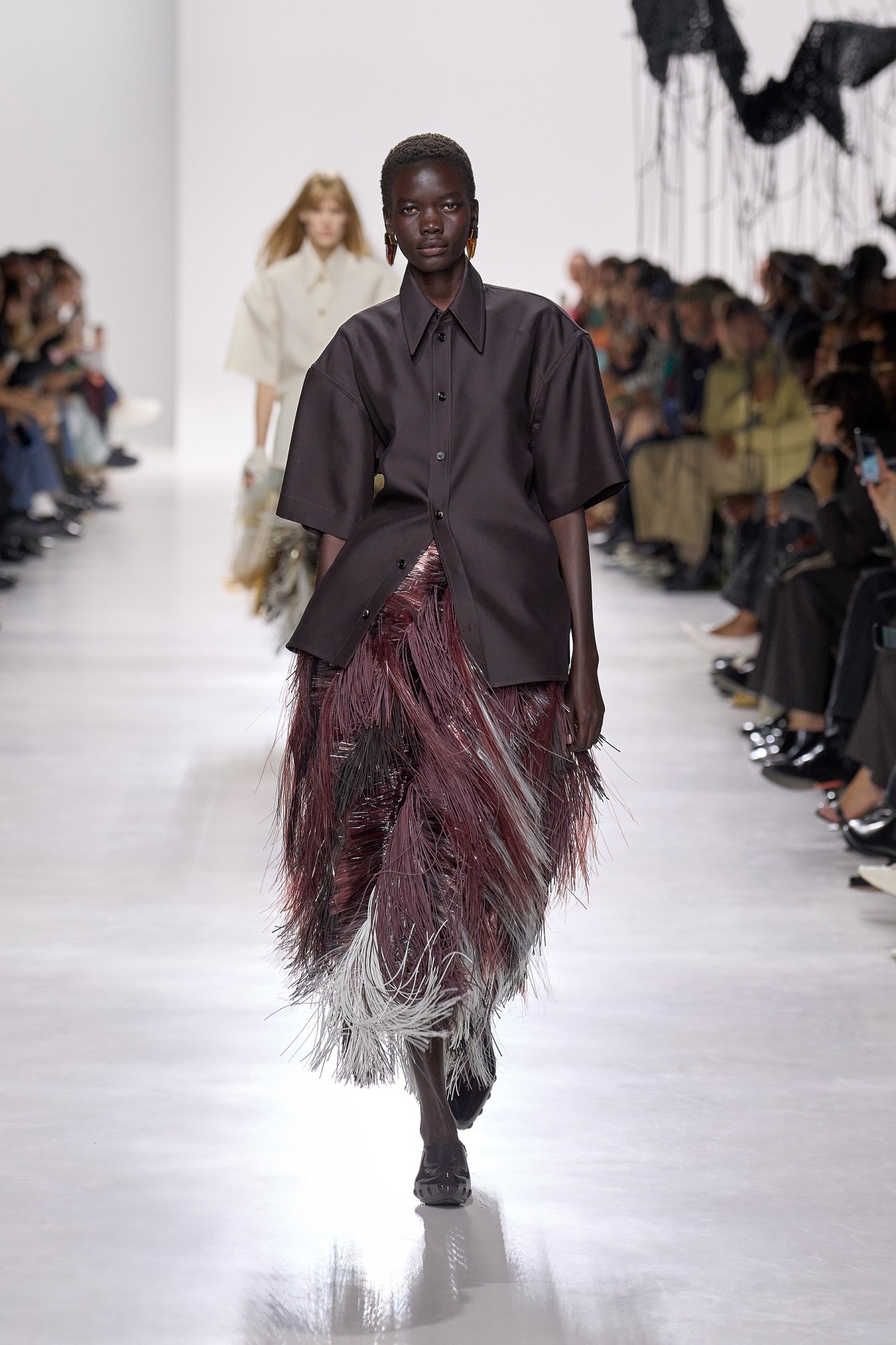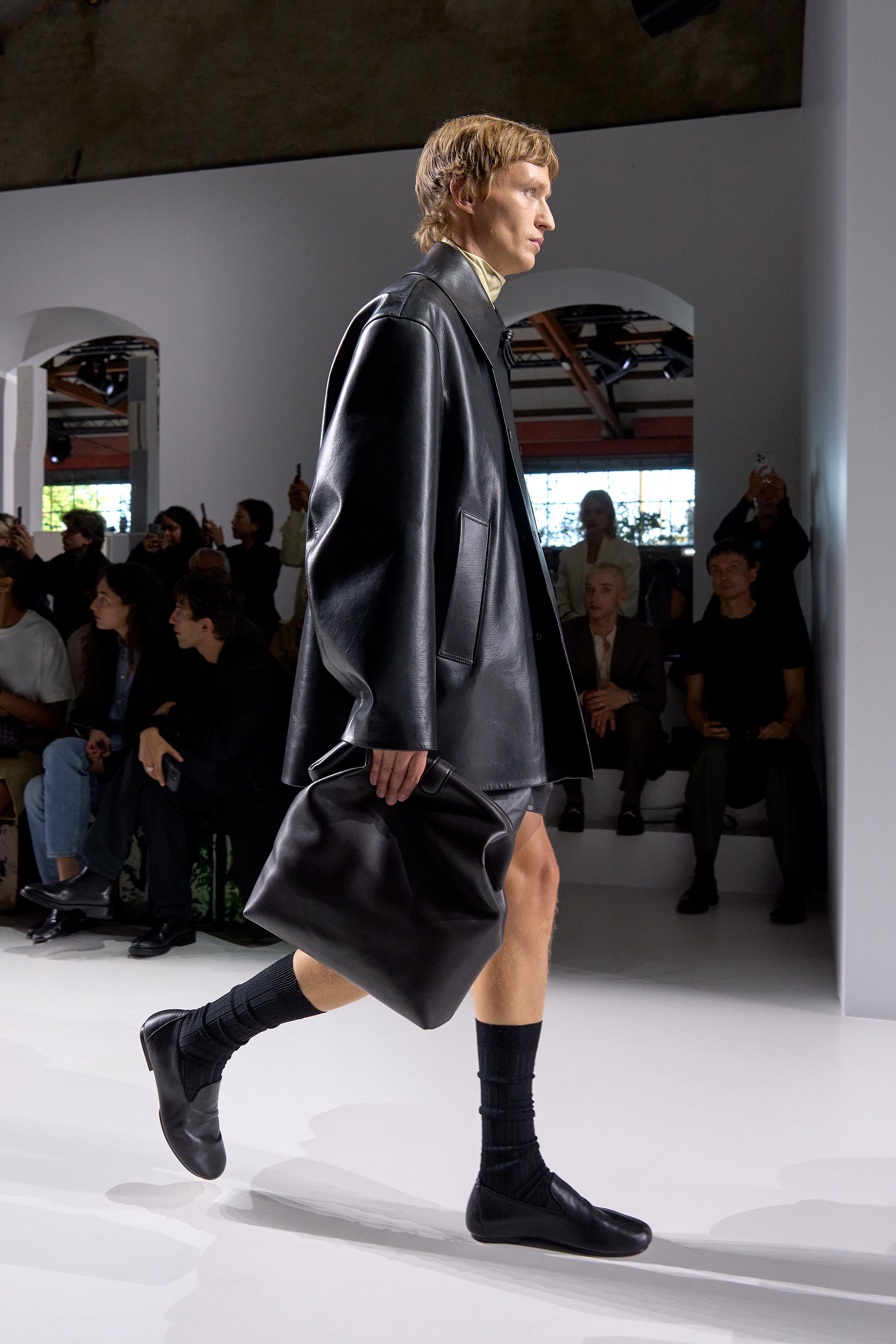Summer 2026 reinterpreta il tema chiave di ‘soft functionality’ da sempre parte dell’identità di Bottega Veneta e del suo iconico Intrecciato. La collezione celebra la meticolosa lavorazione artigianale della maison con giacche e gonne leggere dal movimento fluido, realizzate in vetroresina riciclata, insieme a un mantello in nappa frangiata, che ha richiesto oltre 4.000 ore di lavoro. Linee scultoree incontrano texture ricche e materiche, con nappine, volant e dettagli soffici. I tessuti estivi, leggeri, si combinano a costruzioni sartoriali rigorose, modellate con la precisione e la disciplina della sartoria maschile tradizionale. Le borse iconiche vengono reinterpretate in nuove forme e proporzioni, mentre tra le novità spiccano la morbida borsa Squash, una clutch da sera con nappine e una tote dalla struttura rigida.
