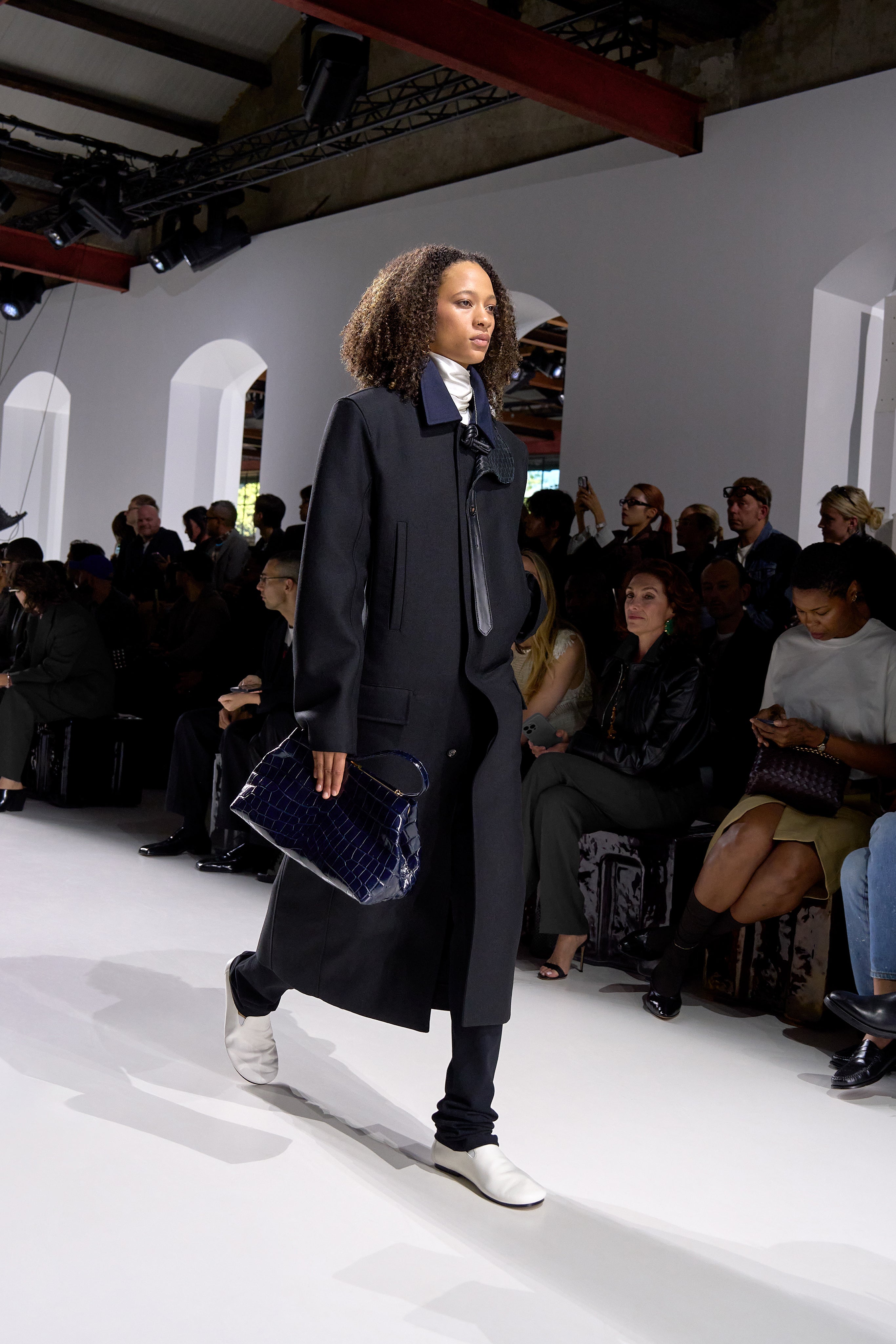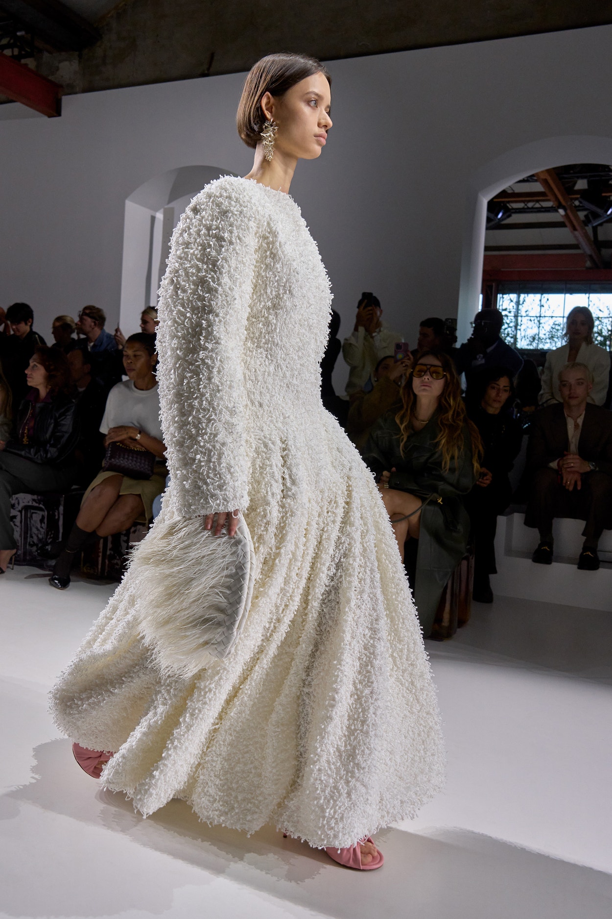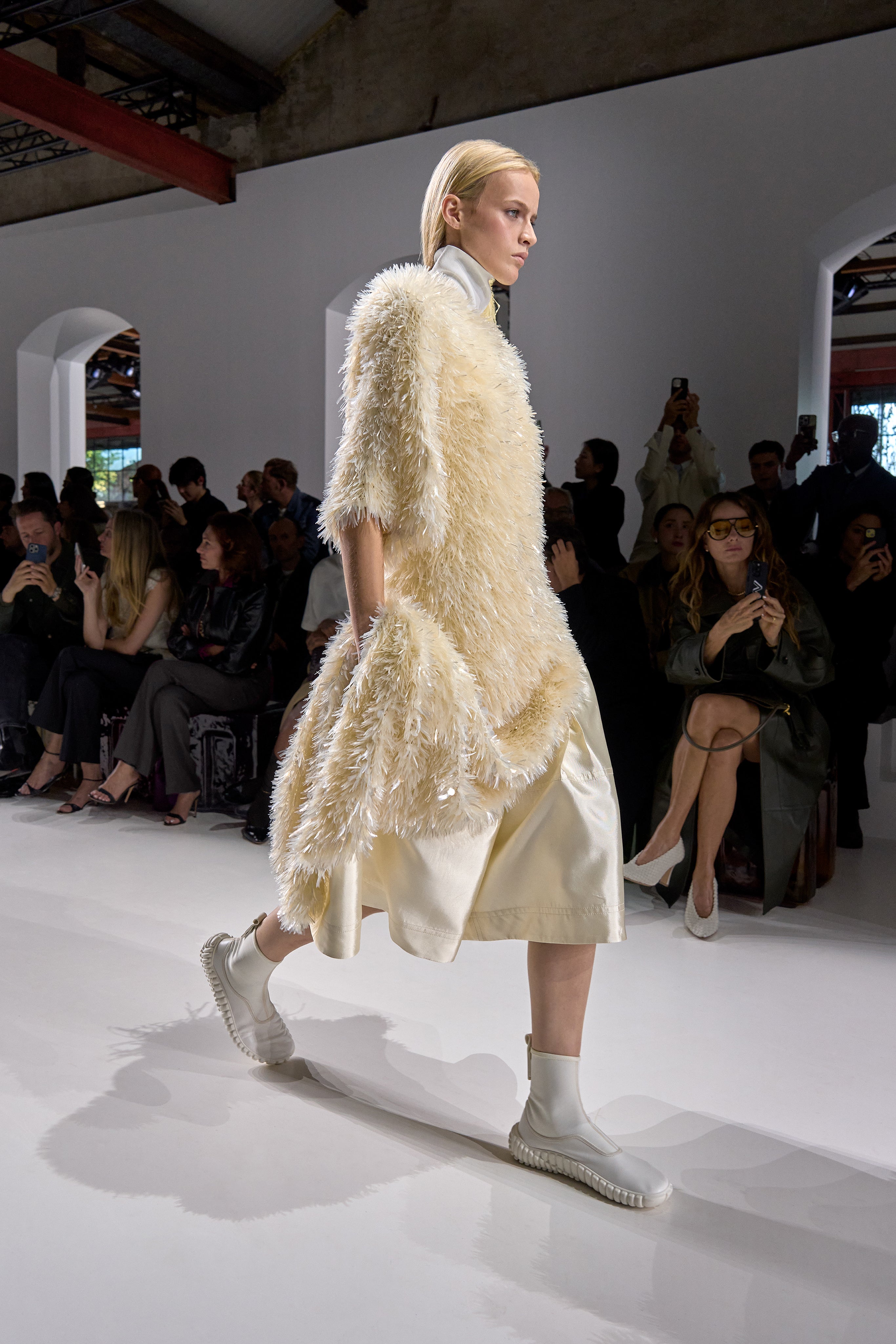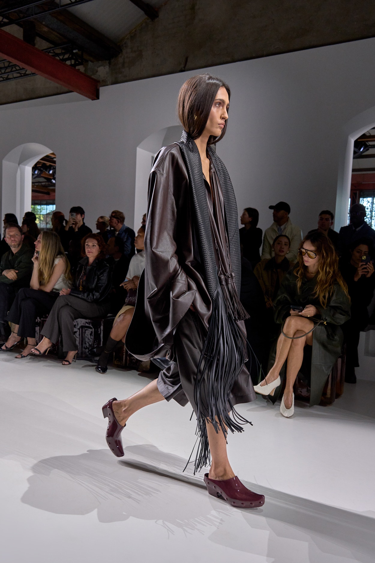 Summer 2026 reinterpreta il tema chiave di ‘soft functionality’ da sempre parte dell’identità di Bottega Veneta e del suo iconico Intrecciato. La collezione celebra la meticolosa lavorazione artigianale della maison con giacche e gonne leggere dal movimento fluido, realizzate in vetroresina riciclata, insieme a un mantello in nappa frangiata, che ha richiesto oltre 4.000 ore di lavoro. Linee scultoree incontrano texture ricche e materiche, con nappine, volant e dettagli soffici. I tessuti estivi, leggeri, si combinano a costruzioni sartoriali rigorose, modellate con la precisione e la disciplina della sartoria maschile tradizionale. Le borse iconiche vengono reinterpretate in nuove forme e proporzioni, mentre tra le novità spiccano la morbida borsa Squash, una clutch da sera con nappine e una tote dalla struttura rigida.