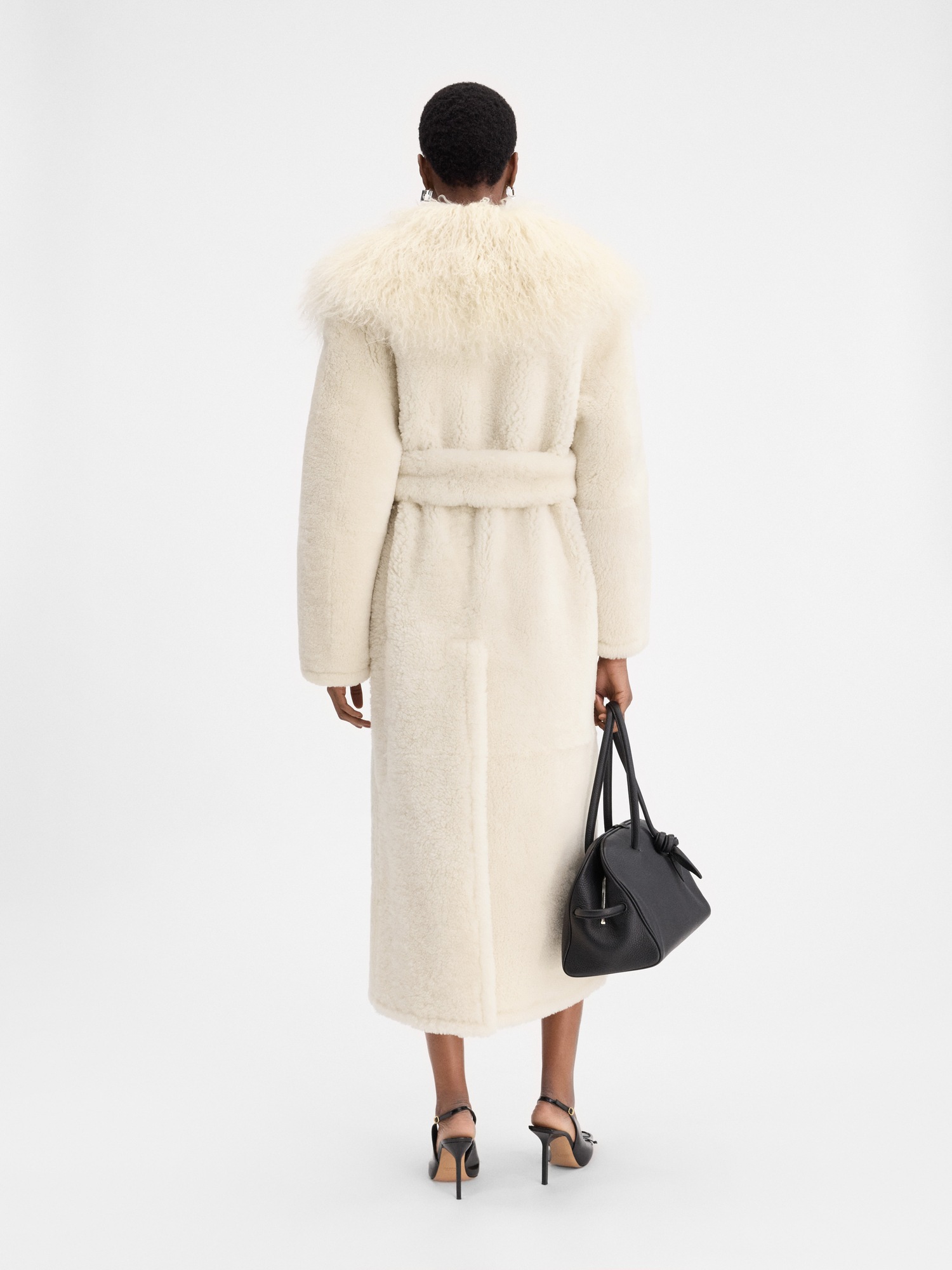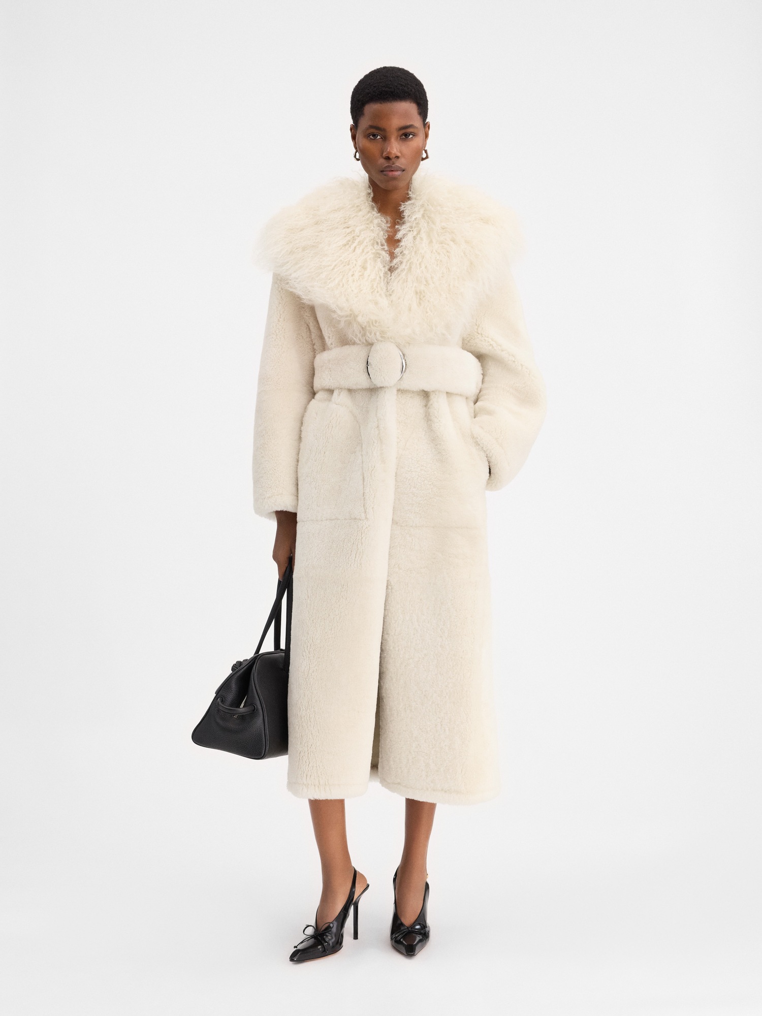 Cappotto lungo in shearling, taglio dritto oversize, colletto ampio a pelo lungo, modello non foderato, cintura in vita con fibbia rotonda argento, tasche laterali. Prezzo scontato € 3.670 per info e per acquistarlo, clicca qui.