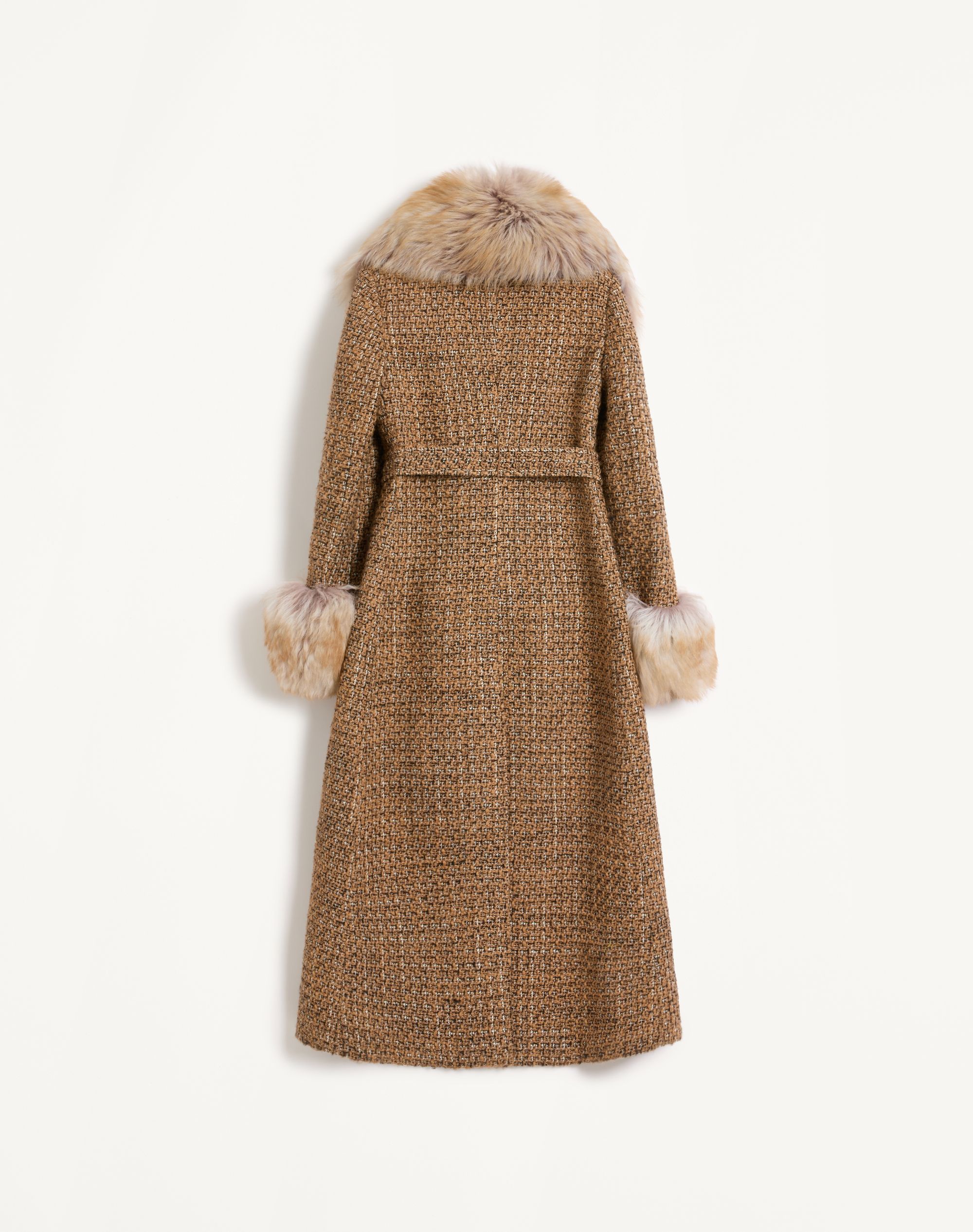 Cappotto in Fantasy Tweed, inserti Montone su scollo e polso, cintura in vita. Prezzo scontato € 4.500 per info e per acquistarlo, clicca qui.