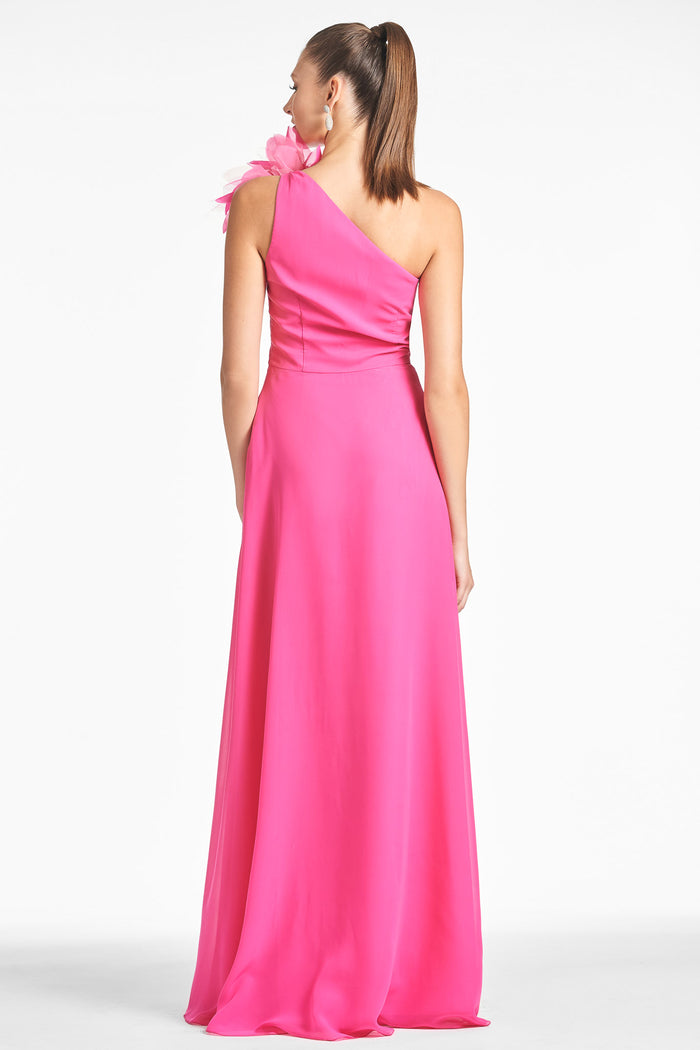L’abito Allegra in Think Pink è l’abito etereo e femminile dei sogni. Realizzata in solido chiffon, questa silhouette monospalla presenta un’applique floreale abbinata per un tocco di drammaticità. Prezzo € 775 per info e per acquistarlo, clicca qui.