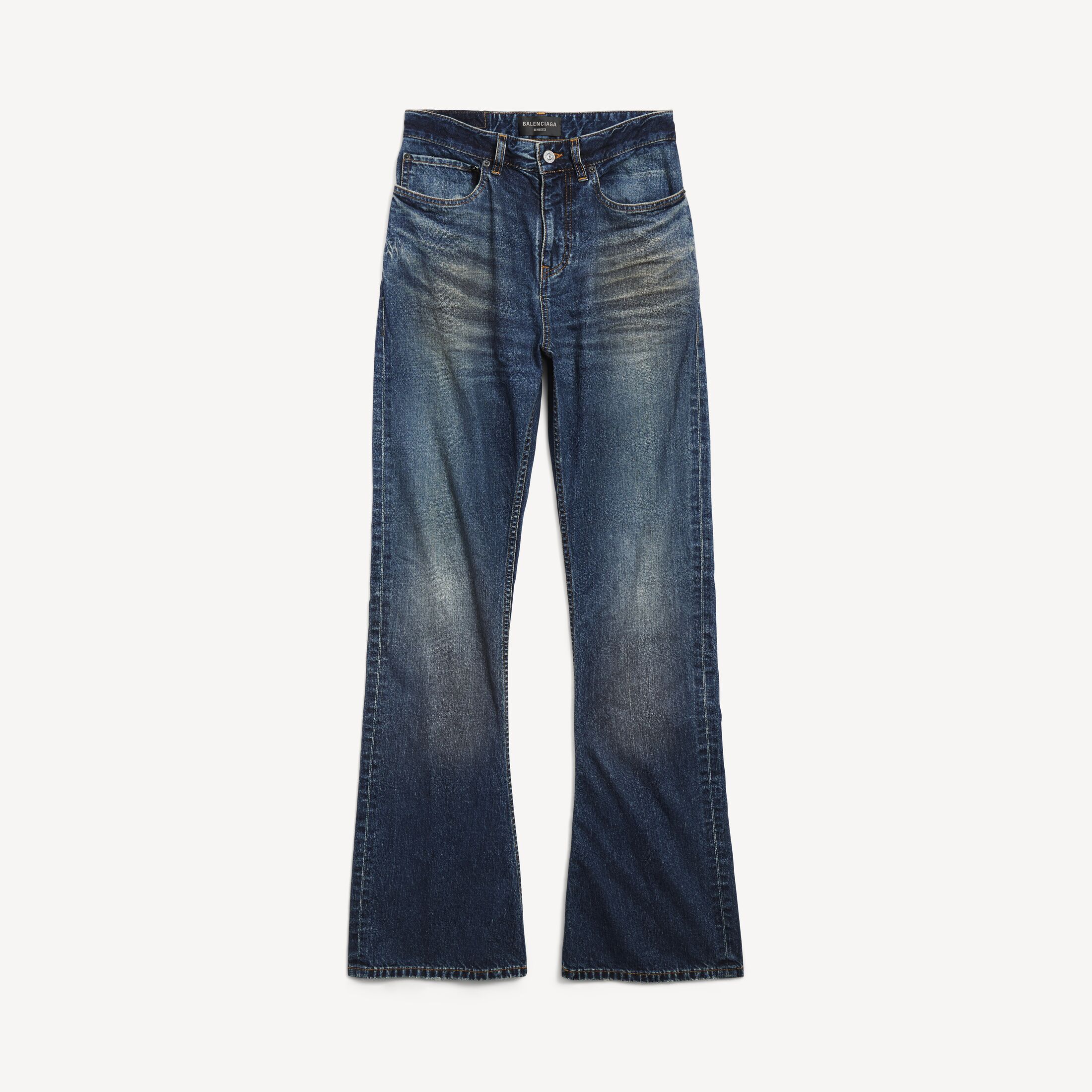 Pantaloni Bootcut in denim di cotone blu, morbido denim left hand nero, patta con zip nascosta, cinque passanti in vita, cinque tasche, applicazione Balenciaga sul retro. Prezzo € 695 per info e per acquistarli, clicca qui.