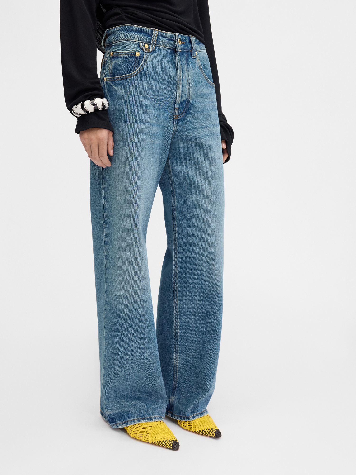 Jeans oversize a vita media, denim lavato indaco, gamba lunga e ampia, passante J, cinque tasche, borchie e rivetti in metallo, chiusura con bottoni. Prezzo € 450 per info e per acquistarlo, clicca qui.